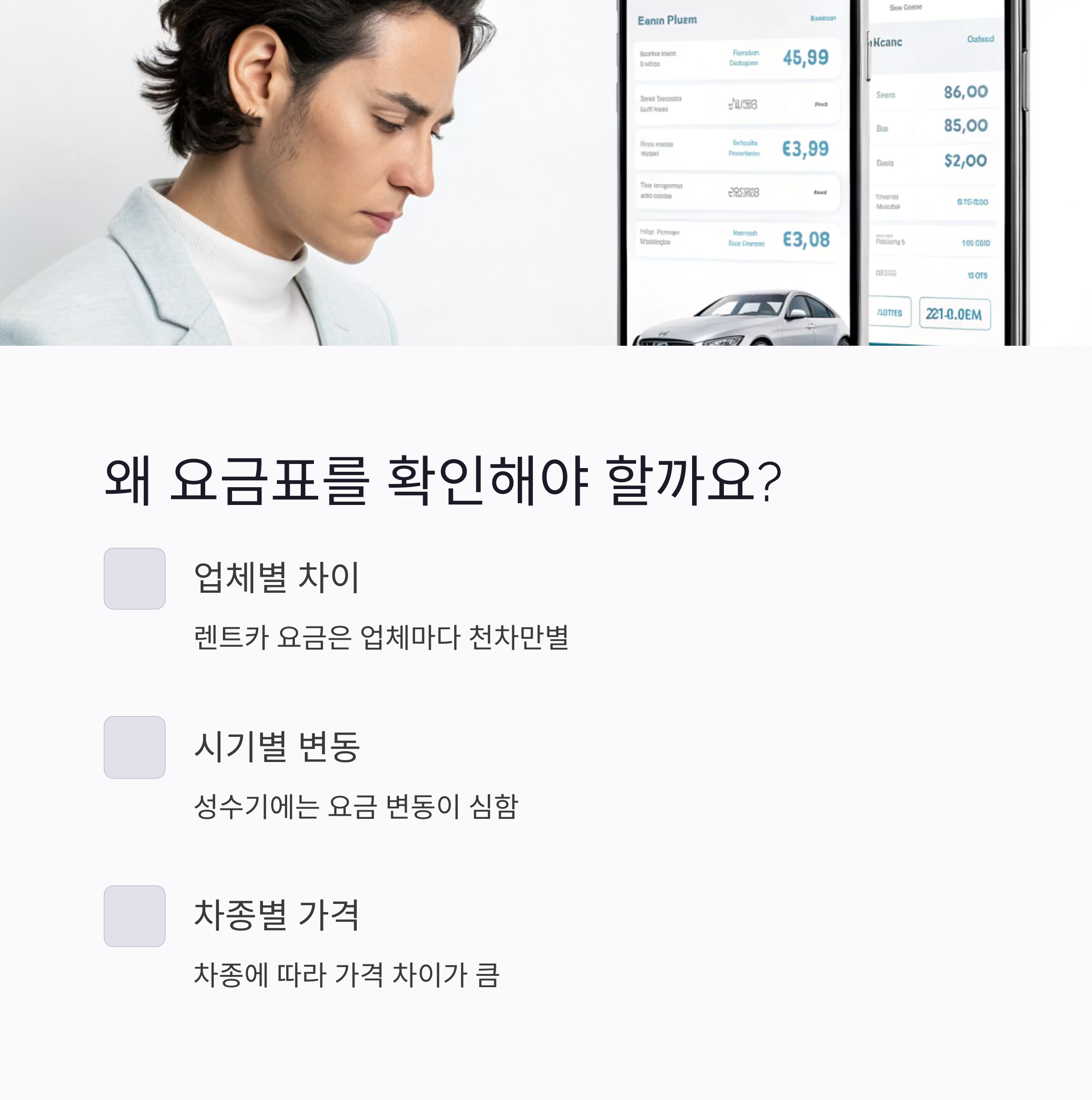 렌트카 요금은 업체, 차종, 시기에 따라 크게 달라집니다.