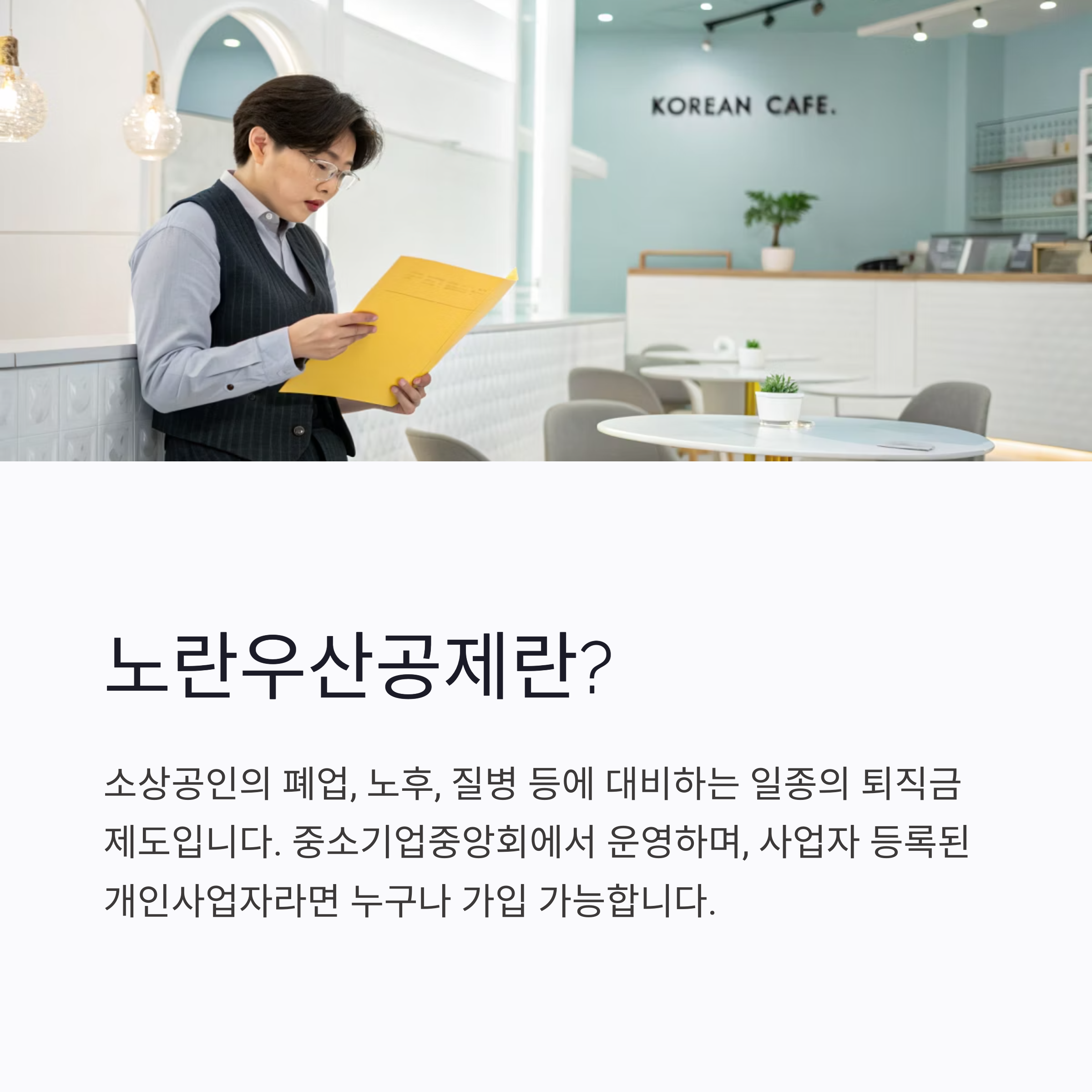 노란우산공제는 소상공인의 폐업이나 노후, 질병 등 예상치 못한 상황에 대비할 수 있도록 마련된 일종의 퇴직금 제도예요. 중소기업중앙회에서 운영하고 있고, 사업자 등록이 된 개인사업자라면 누구나 가입할 수 있습니다. 공제금은 본인이 월별로 일정 금액을 적립하면서 쌓이게 되는데, 사업을 그만두거나 일정 기간이 지나면 일시금 또는 분할금 형태로 받을 수 있어요.