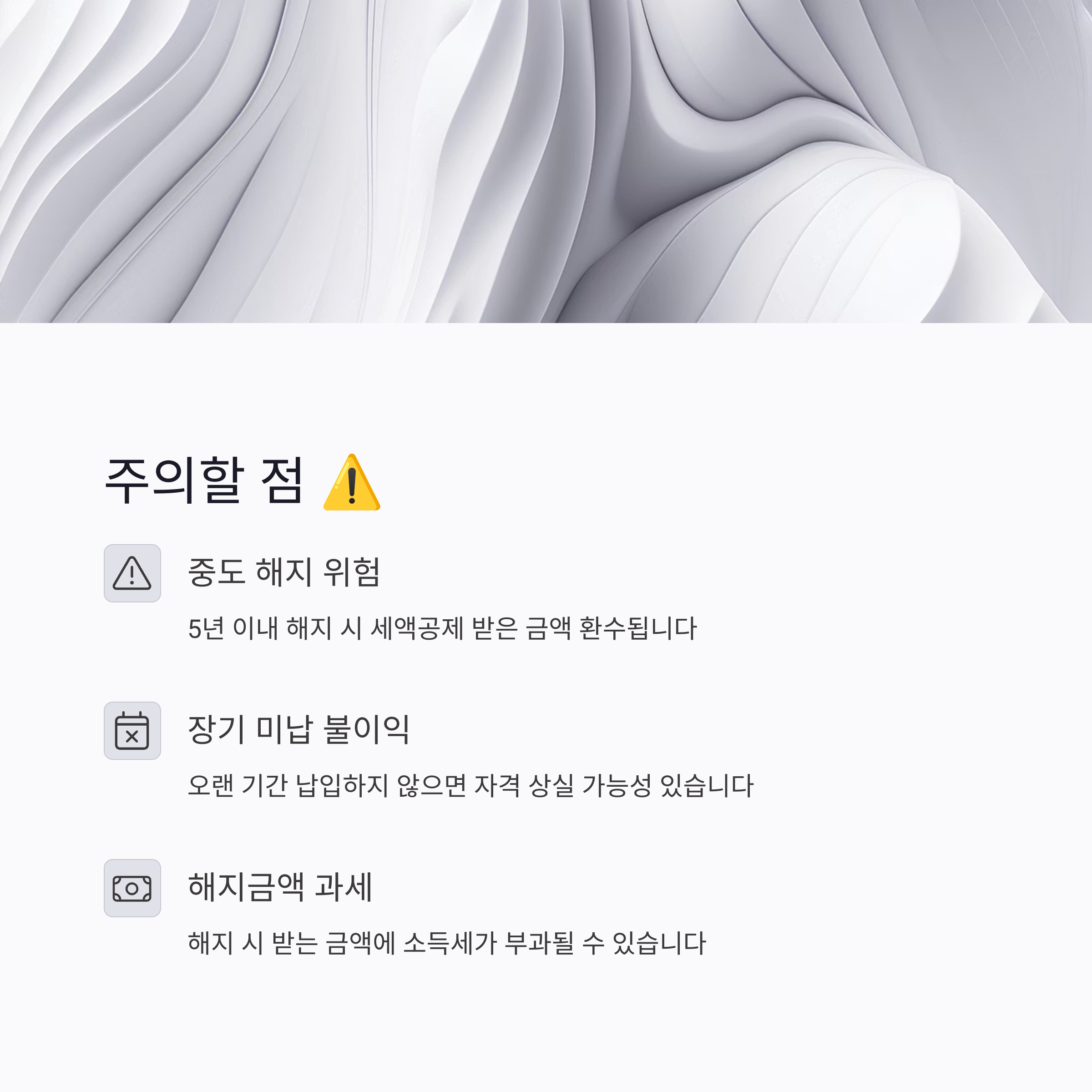 5년 이내 해지 시 받은 세액공제를 토해내야 하며, 해지금도 과세 대상이 될 수 있어요.