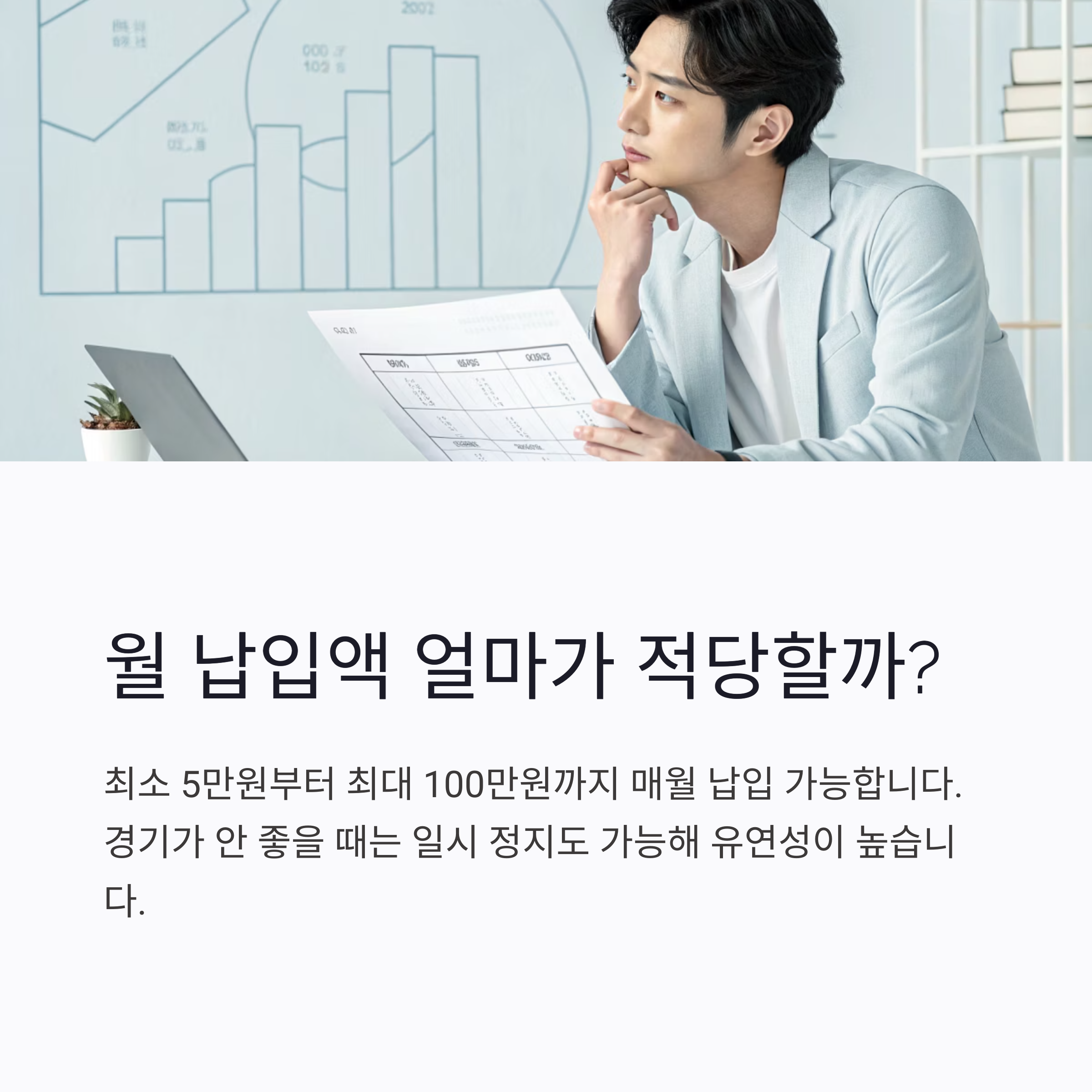 월 5만원에서 100만원 사이에서 자유롭게 변경 가능하며, 필요 시 납입 정지도 할 수 있어요.