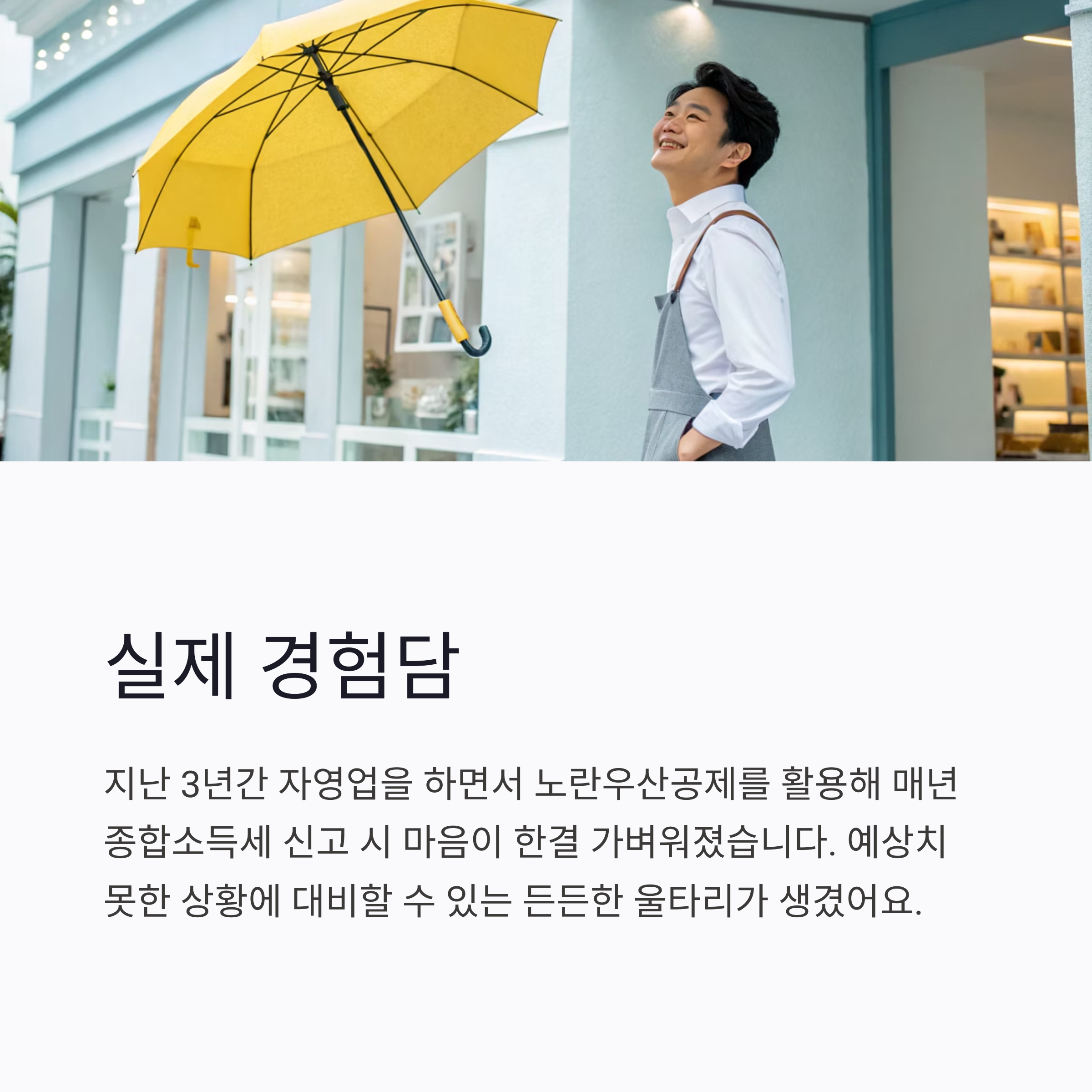 노란우산공제는 단순한 절세 수단 그 이상입니다. 소득공제 효과는 물론, 예상치 못한 상황에서 우리 가족과 삶을 지켜줄 든든한 울타리가 되어줄 수 있죠. 여러분도 이 제도를 통해 매년 세금 부담은 줄이고, 노후도 미리 준비해보세요. 직접 겪어보면 정말 생각보다 만족도가 높을 거예요. 혹시 궁금한 점이나 경험담 있으시다면 댓글로 함께 나눠주세요. 실생활 팁은 공유할수록 더 큰 힘이 되니까요!