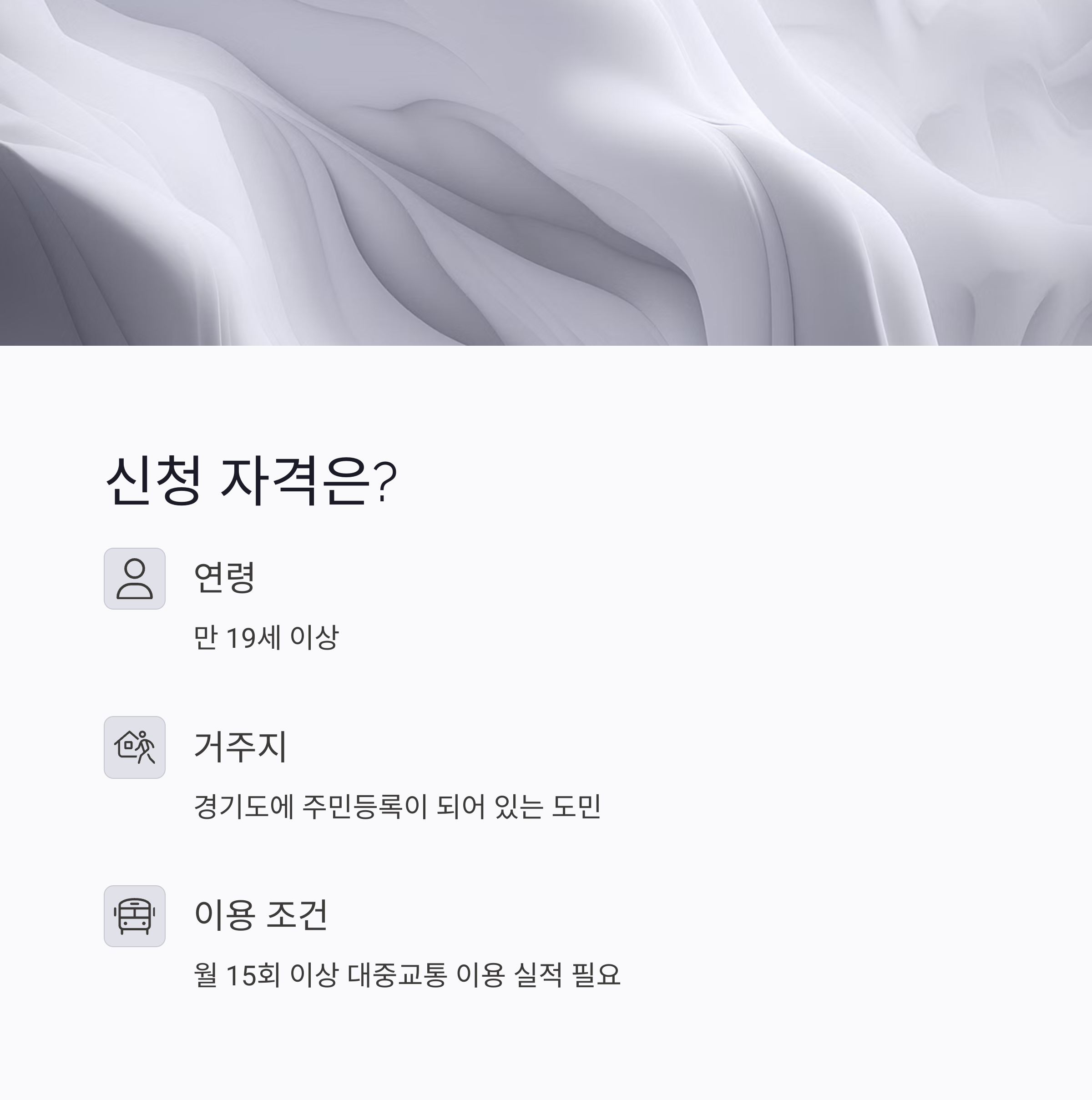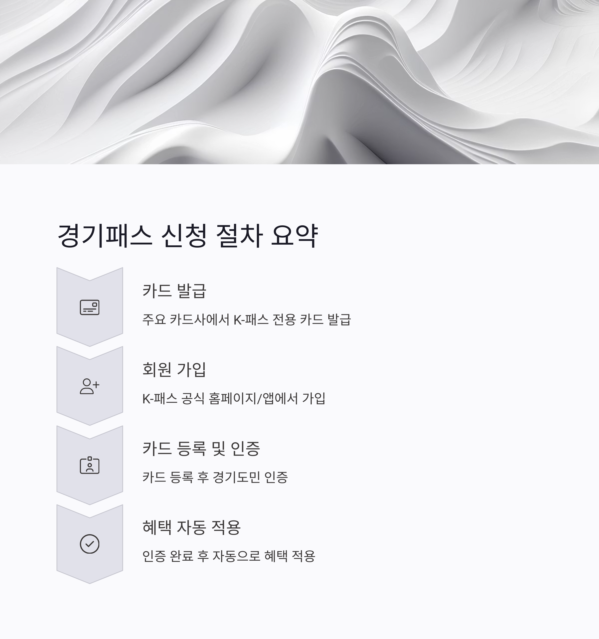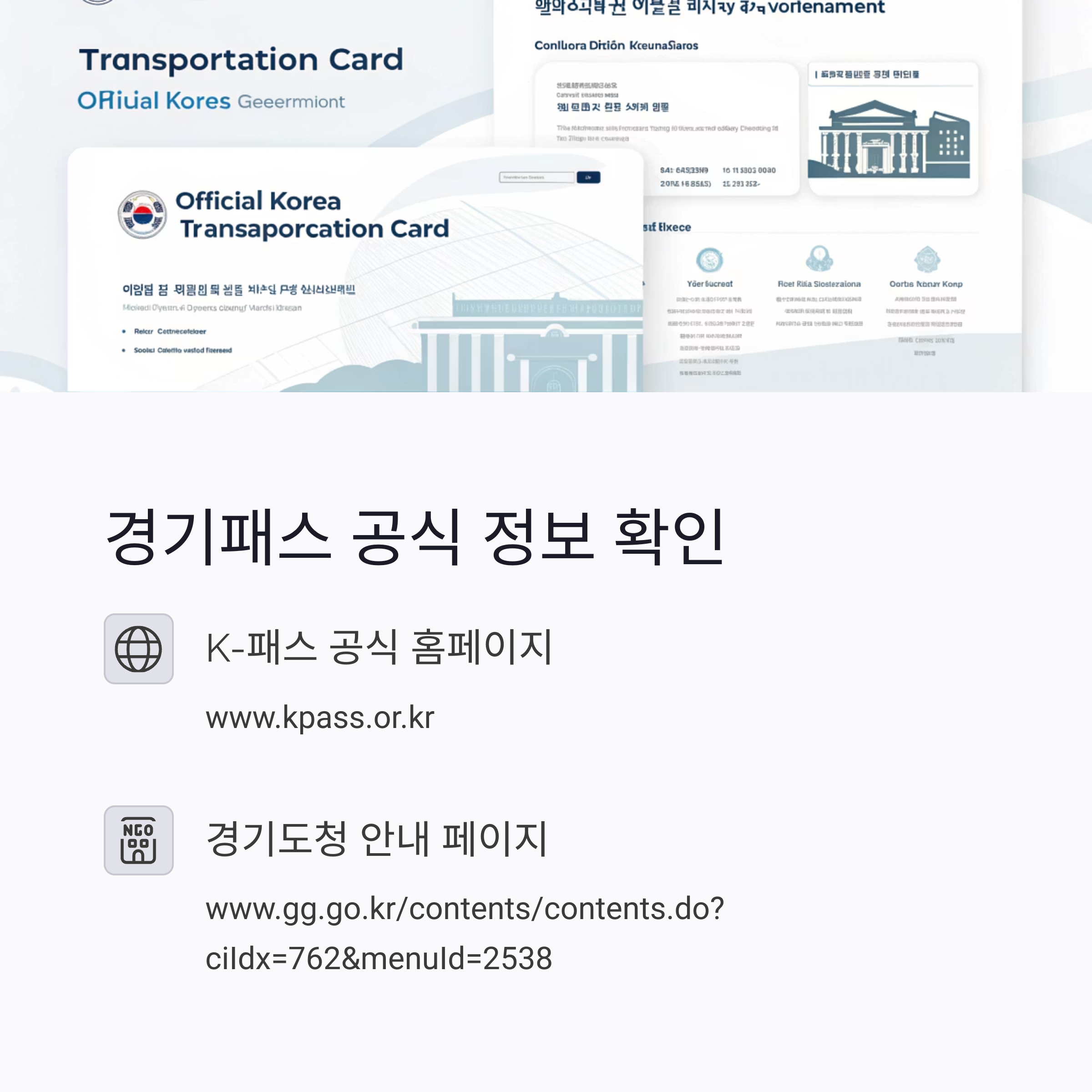 - ์ ์ฒญ ๋ฐฉ๋ฒ: K-ํจ์ค ์นด๋ ๋ฐ๊ธ → ํ์ ๊ฐ์ ๋ฐ ์นด๋ ๋ฑ๋ก → ์ฃผ์์ง ์ธ์ฆ → ์๋ ํํ ์ ์ฉ