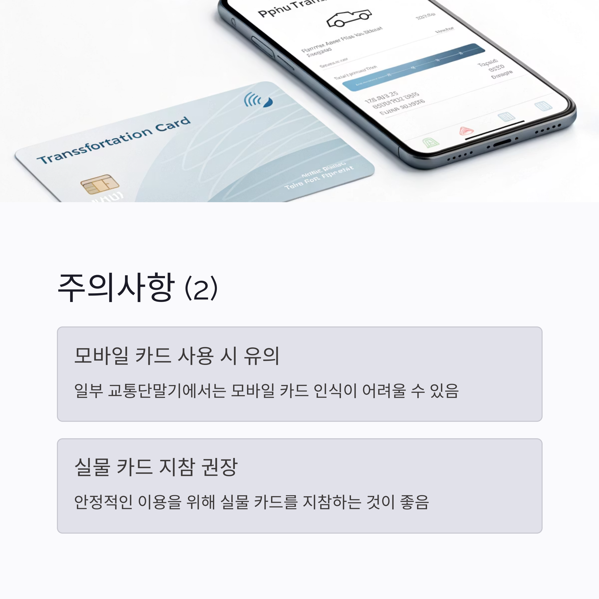 - ๋ชจ๋ฐ์ผ ์นด๋ ์ฌ์ฉ ์ ์ ์: ์ผ๋ถ ๊ตํต๋จ๋ง๊ธฐ์์๋ ๋ชจ๋ฐ์ผ ์นด๋ ์ธ์์ด ์ด๋ ค์ธ ์ ์์ผ๋ฏ๋ก, ์ค๋ฌผ ์นด๋๋ฅผ ์ง์ฐธํ๋ ๊ฒ์ด ์ข์ต๋๋ค.