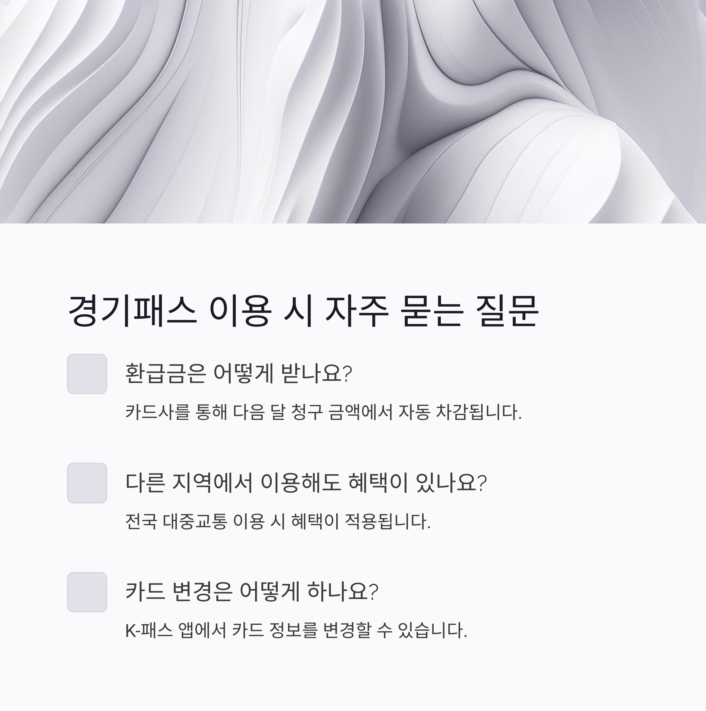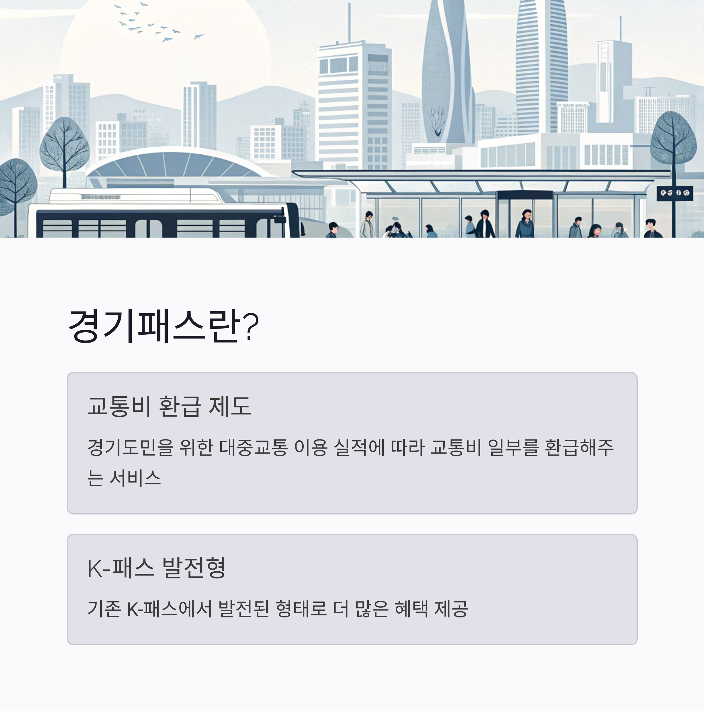 ๊ฒฝ๊ธฐํจ์ค๋ ๊ฒฝ๊ธฐ๋๋ฏผ์ ์ํ ๊ตํต๋น ํ๊ธ ์ ๋๋ก, ๋์ค๊ตํต ์ด์ฉ ์ค์ ์ ๋ฐ๋ผ ๊ตํต๋น์ ์ผ๋ถ๋ฅผ ํ๊ธํด์ฃผ๋ ์๋น์ค์ ๋๋ค. ๊ธฐ์กด์ K-ํจ์ค์์ ๋ฐ์ ๋ ํํ๋ก, ๊ฒฝ๊ธฐ๋๋ฏผ์๊ฒ ๋ ๋ง์ ํํ์ ์ ๊ณตํฉ๋๋ค.