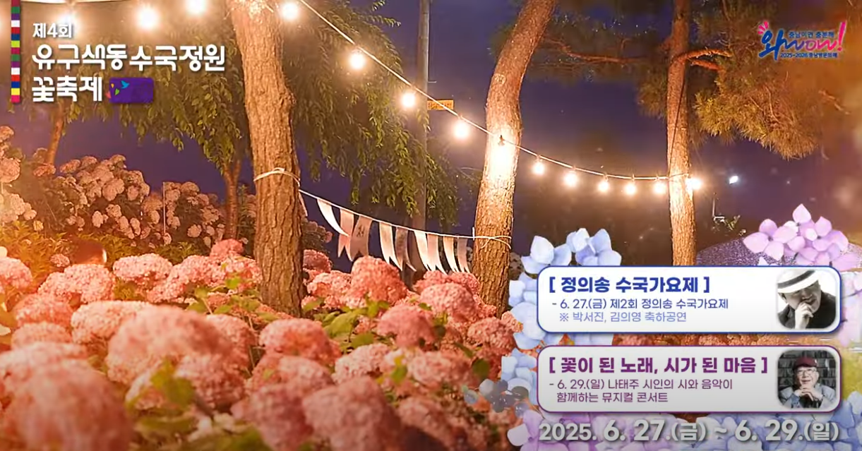 안녕하세요, 여러분! 날씨가 완전히 여름으로 접어든 요즘, 가만히 집에만 있기엔 너무 아쉽잖아요. 마침 공주 유구에서는 지금이 딱 수국이 만개하는 시기라서, 주말 나들이 삼아 다녀왔답니다. '유구색동수국정원'이라는 이름처럼 색색이 물든 수국들 사이를 걷다 보면, 마치 동화 속 주인공이 된 기분이랄까요? 입구부터 인생샷 명소가 줄줄이 이어지고, 향기까지 기분을 살살 녹여주는 그곳—함께 구경해보실래요?
