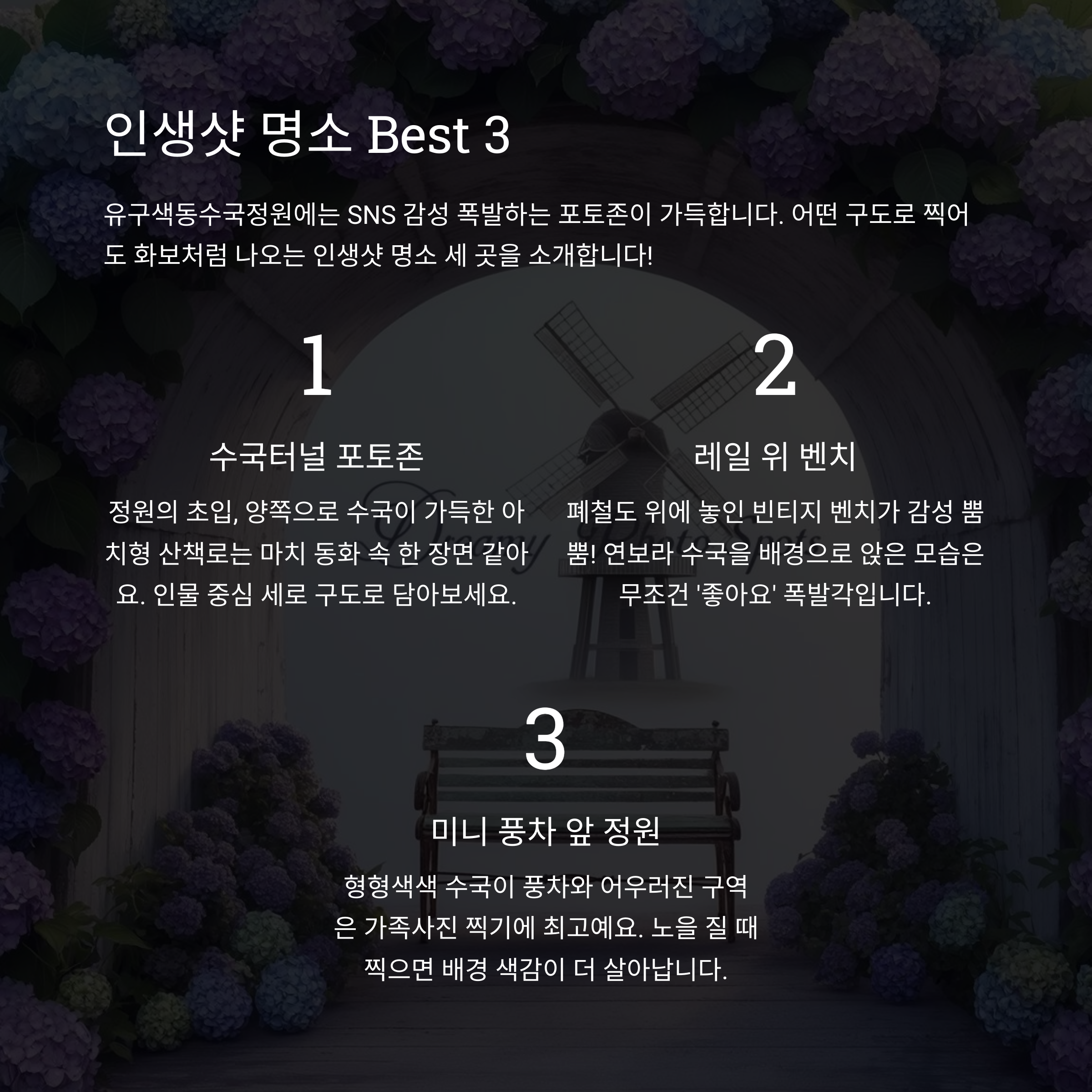 유구색동수국정원에는 SNS 감성 폭발하는 포토존이 가득해요. 어떤 구도로 찍어도 화보처럼 나오는 인생샷 명소 세 곳을 추천할게요!