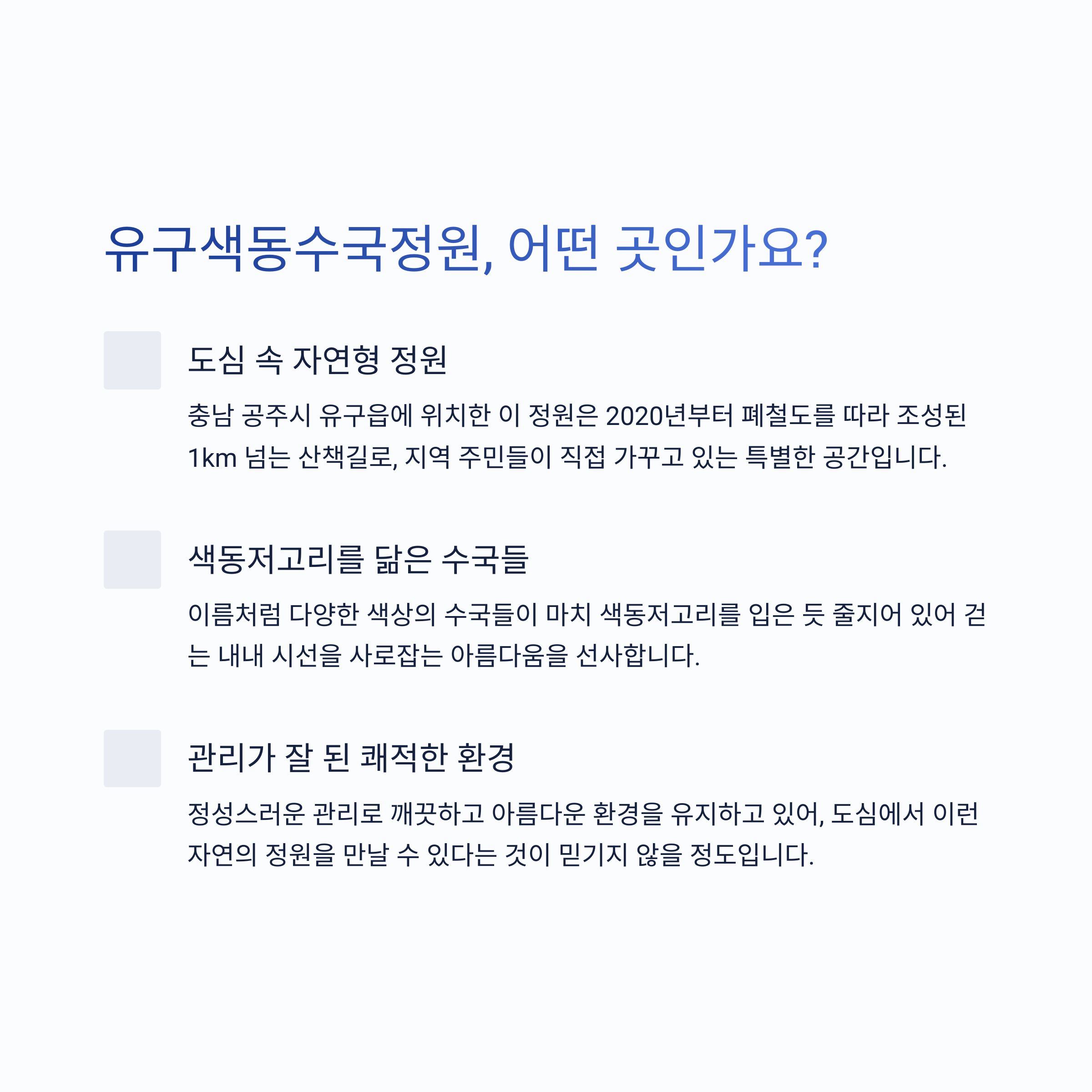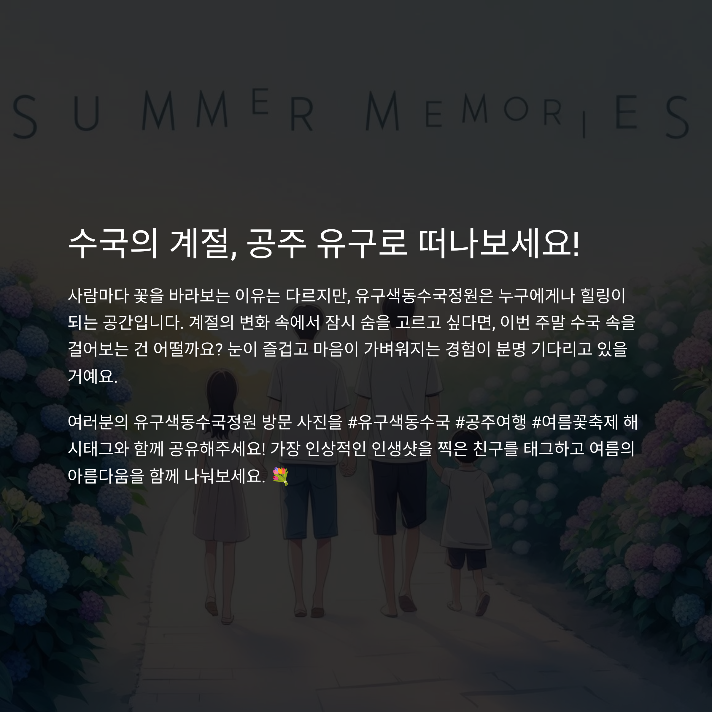 사람마다 꽃을 바라보는 이유는 다르지만, 유구색동수국정원은 누구에게나 힐링이 되는 공간이에요. 계절의 변화 속에서 잠시 숨을 고르고 싶다면, 이번 주말 수국 속을 걸어보는 건 어떨까요? 눈이 즐겁고 마음이 가벼워지는 경험이 분명 기다리고 있을 거예요. 💐