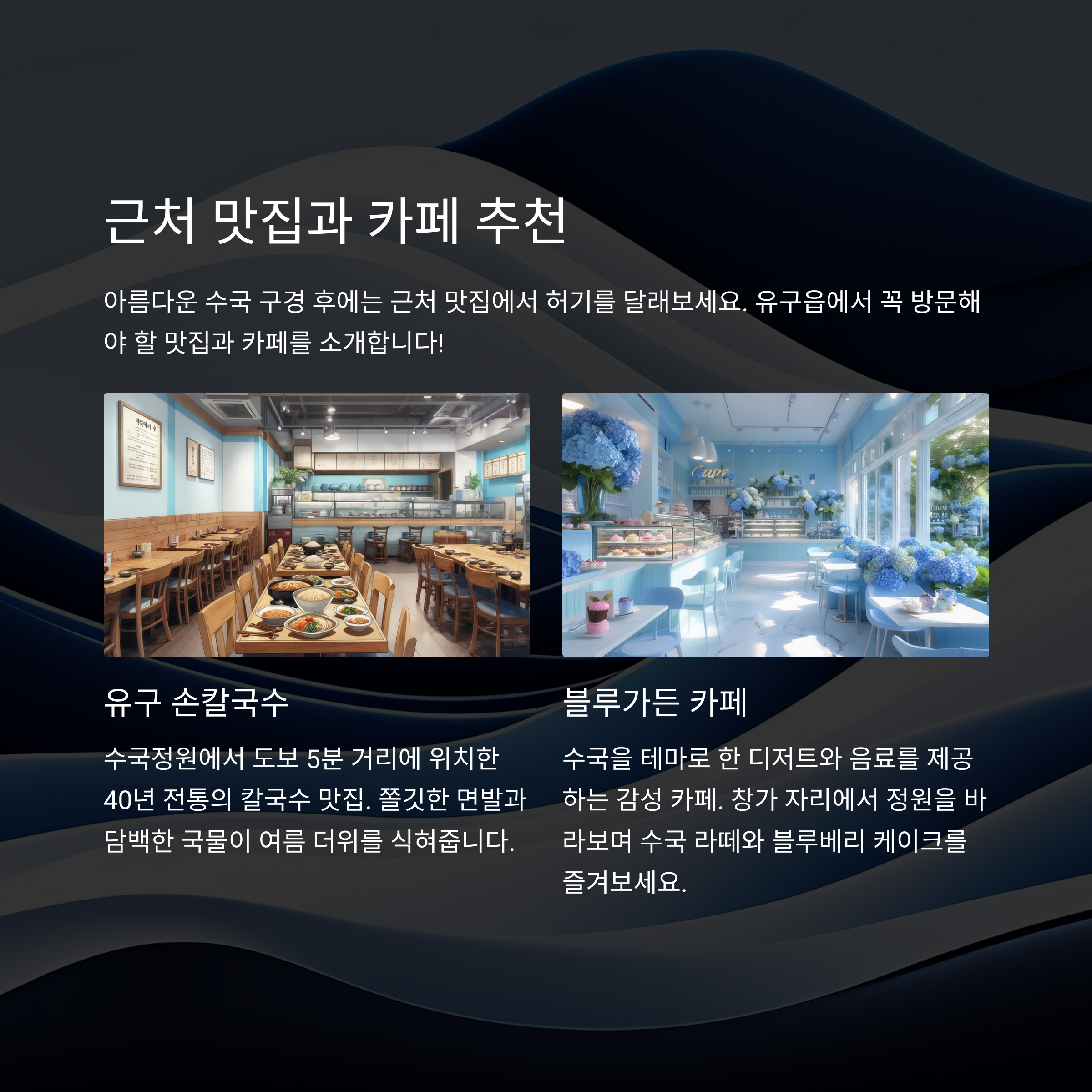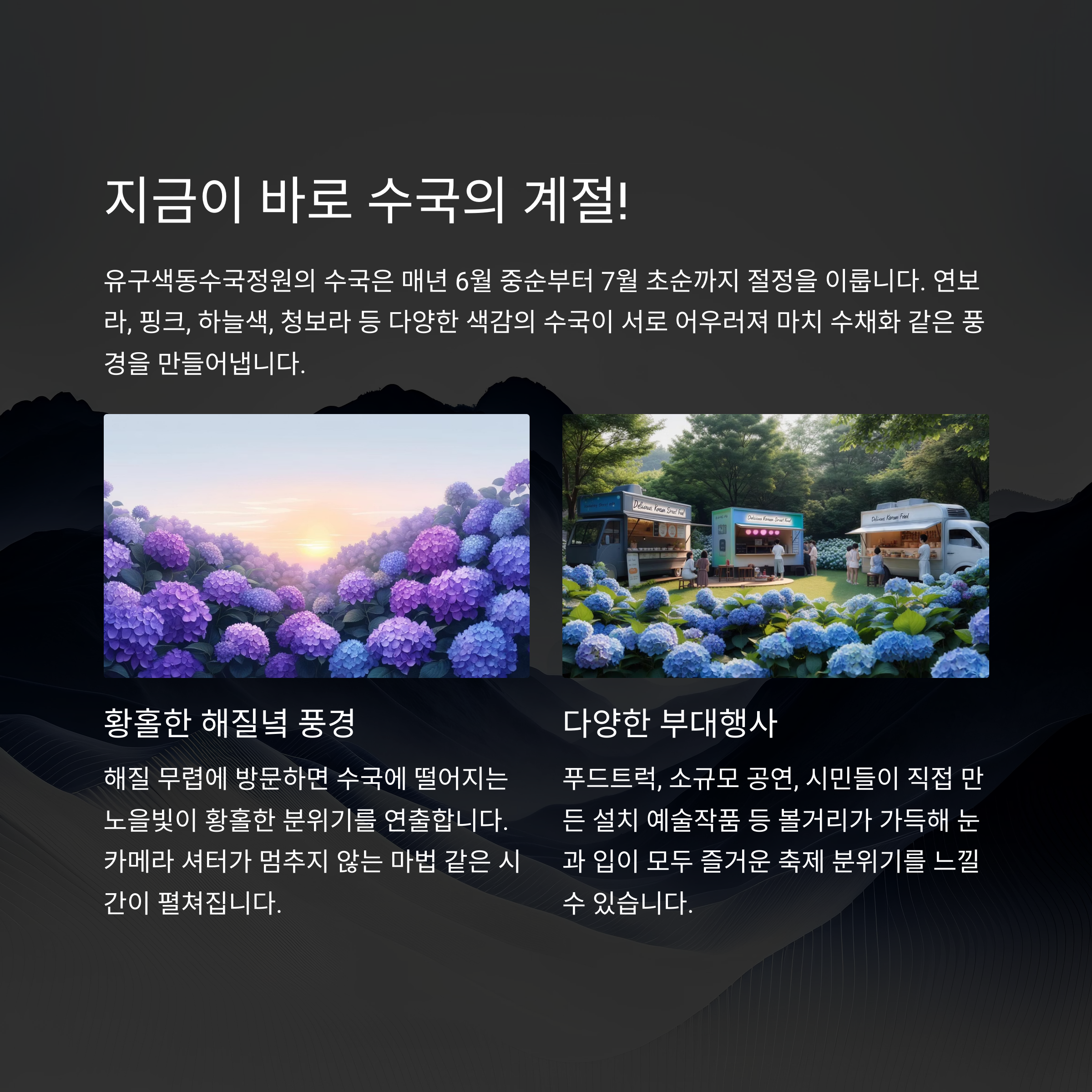 주변에는 푸드트럭, 소규모 공연, 그리고 시민들이 직접 만든 설치 예술작품 등 볼거리가 가득하고요. 특히 해질 무렵 방문하면 수국에 떨어지는 노을빛이 정말 황홀하답니다. 그야말로 카메라 셔터가 멈추지 않는 마법 같은 시간이에요.