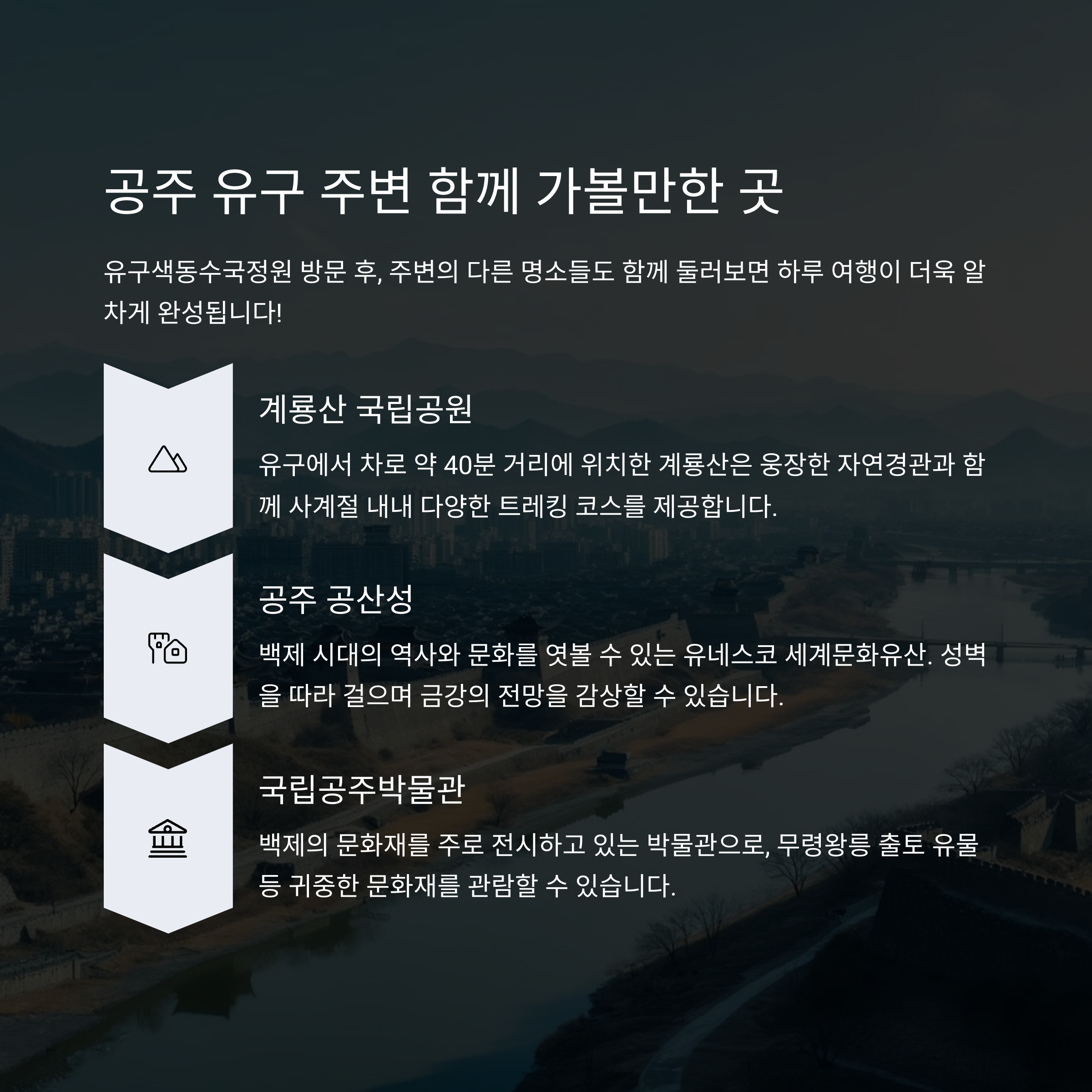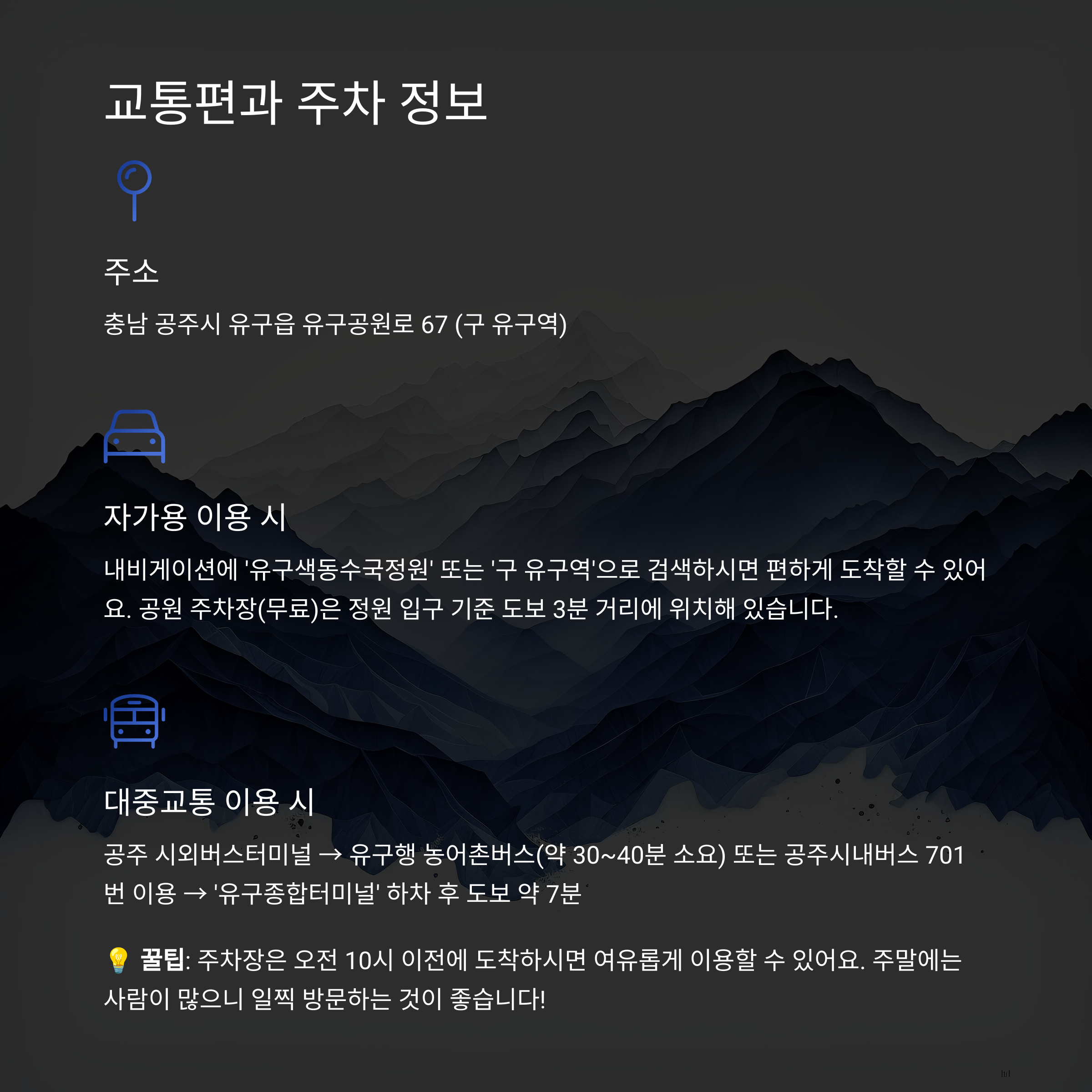 또는 공주시내버스 701번 이용 → ‘유구종합터미널’ 하차 후 도보 약 7분