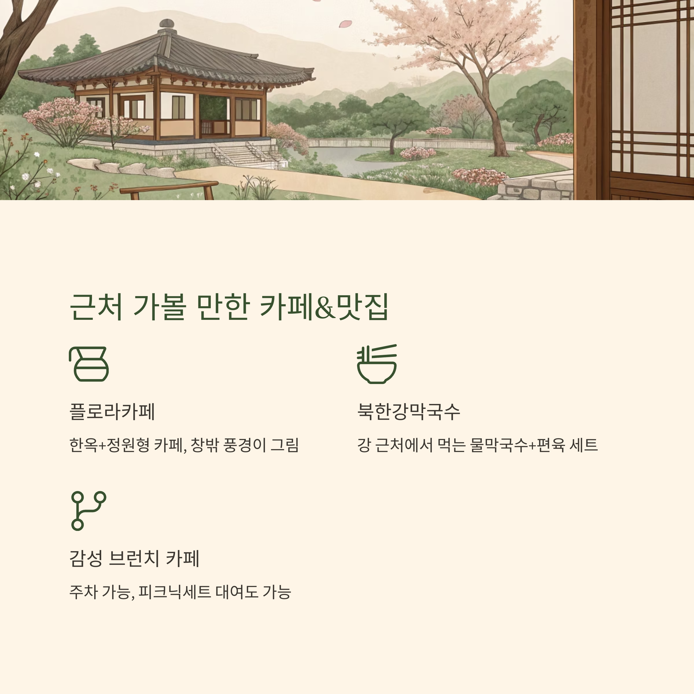 - 감성 브런치 카페들: 주차 가능, 피크닉세트 대여도 가능