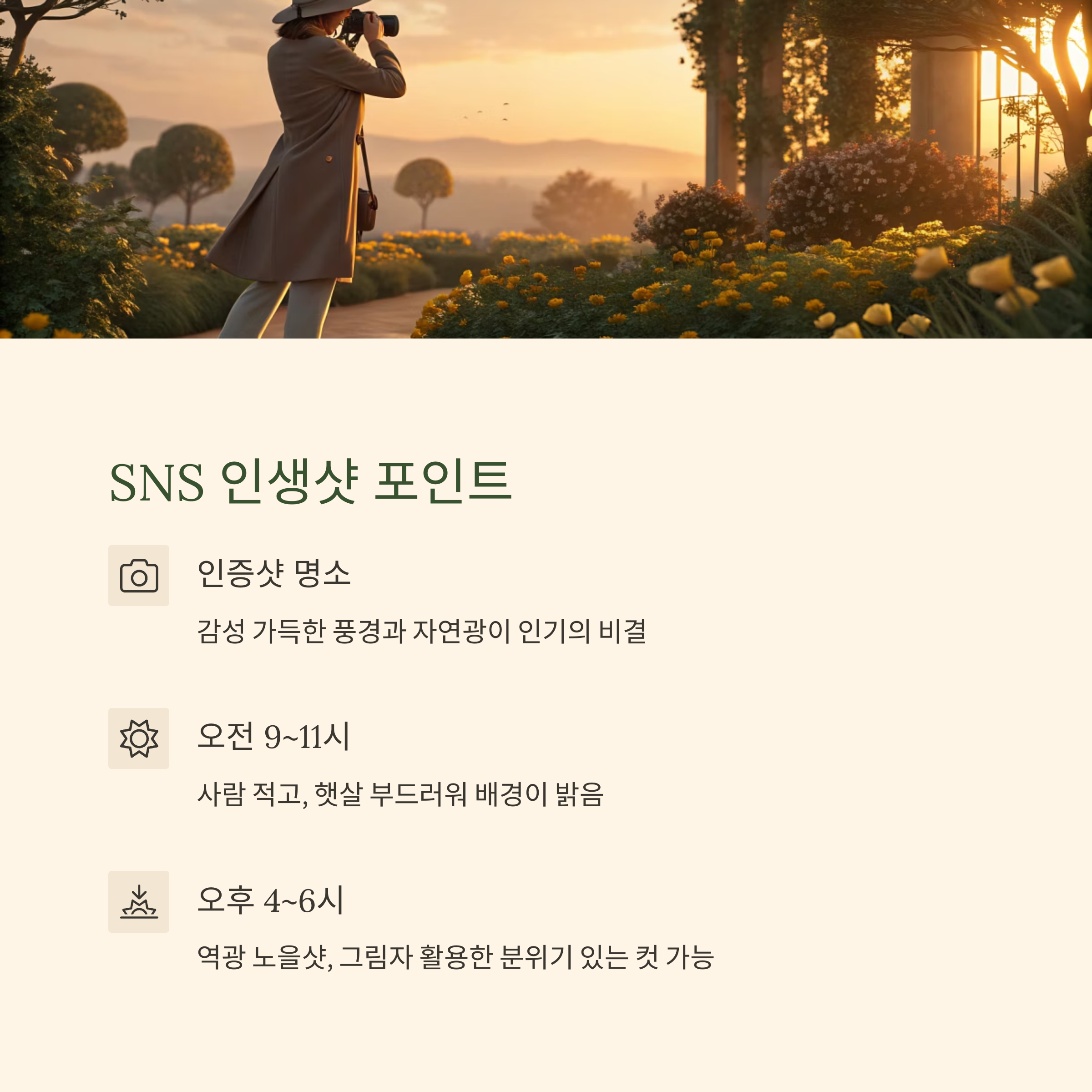- 오후 4~6시: 역광 노을샷, 그림자 활용한 분위기 있는 컷 가능