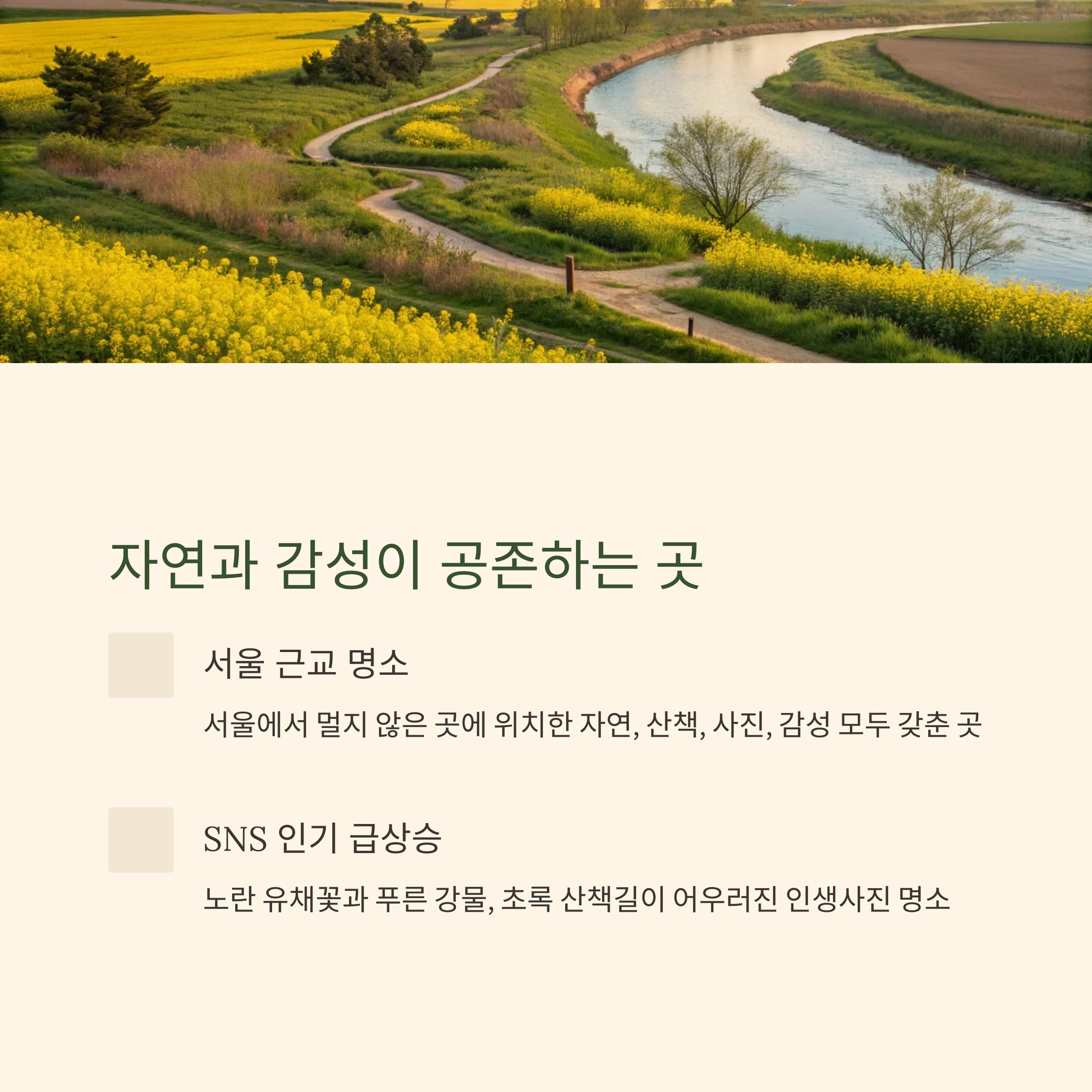 | 포토존 | 유채꽃밭, 꽃길 나무벤치, 강변 산책로 |