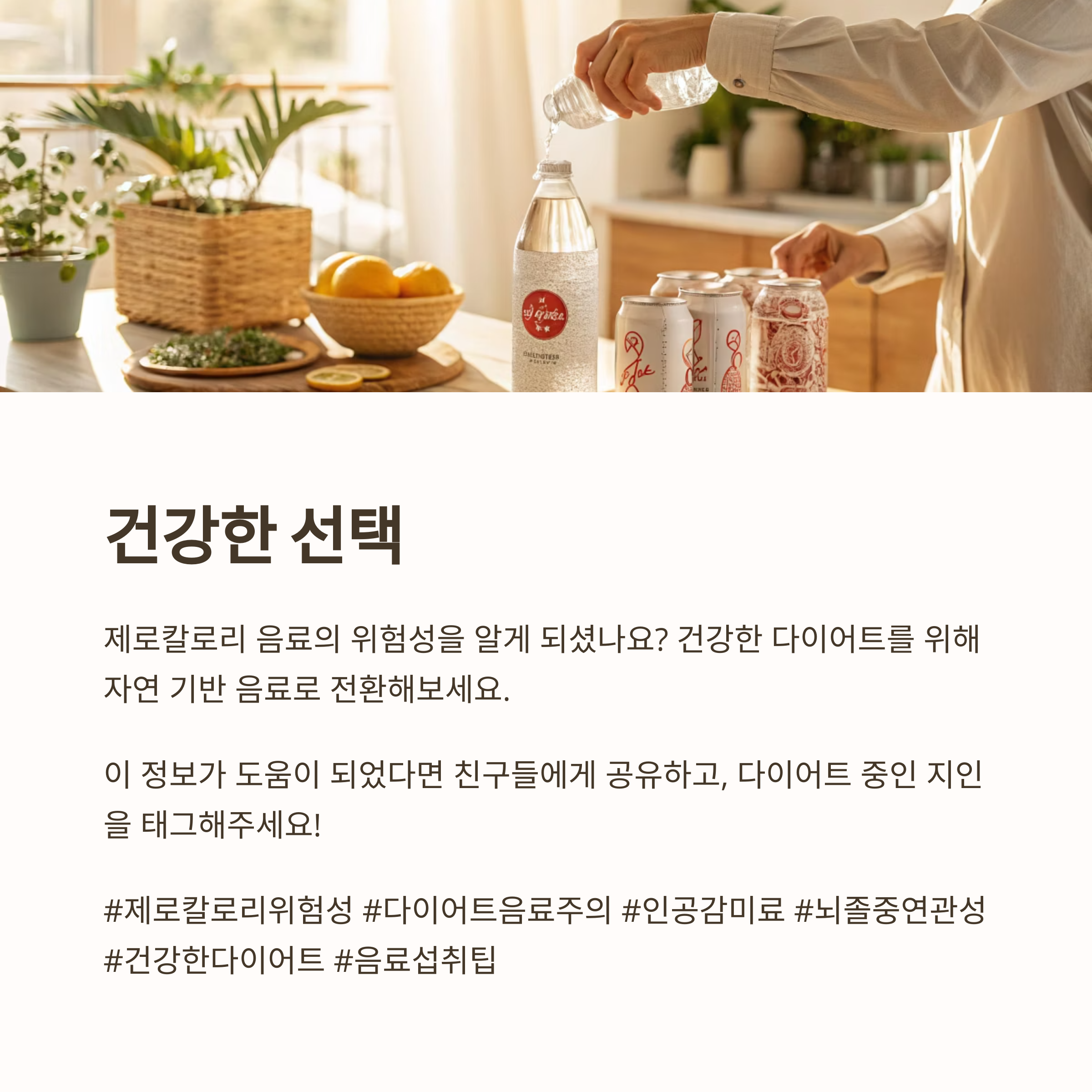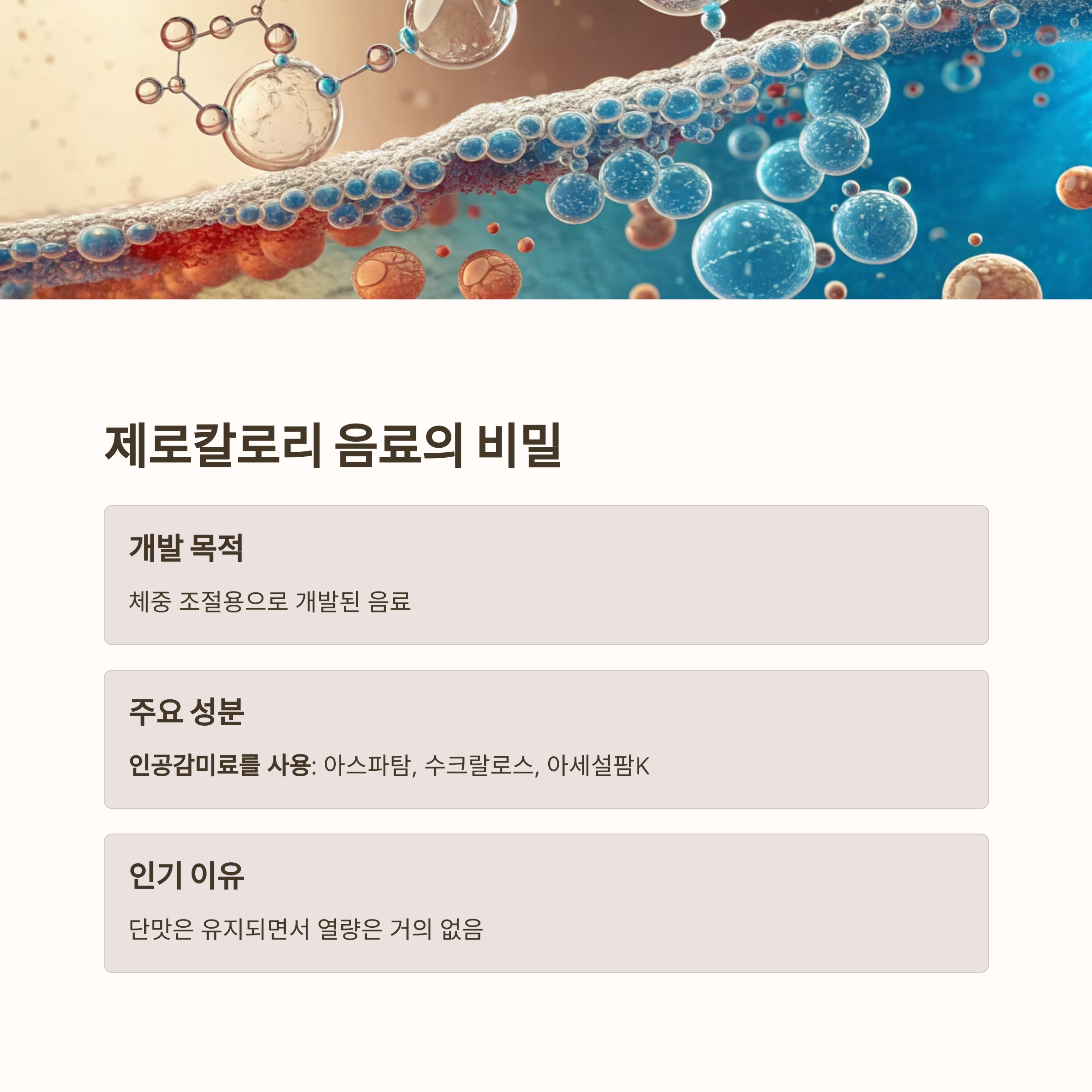 | 제로칼로리 음료 | 0~5 kcal | 단맛 유지, 배출 용이 | 장기 섭취 시 건강 위험 가능성 |