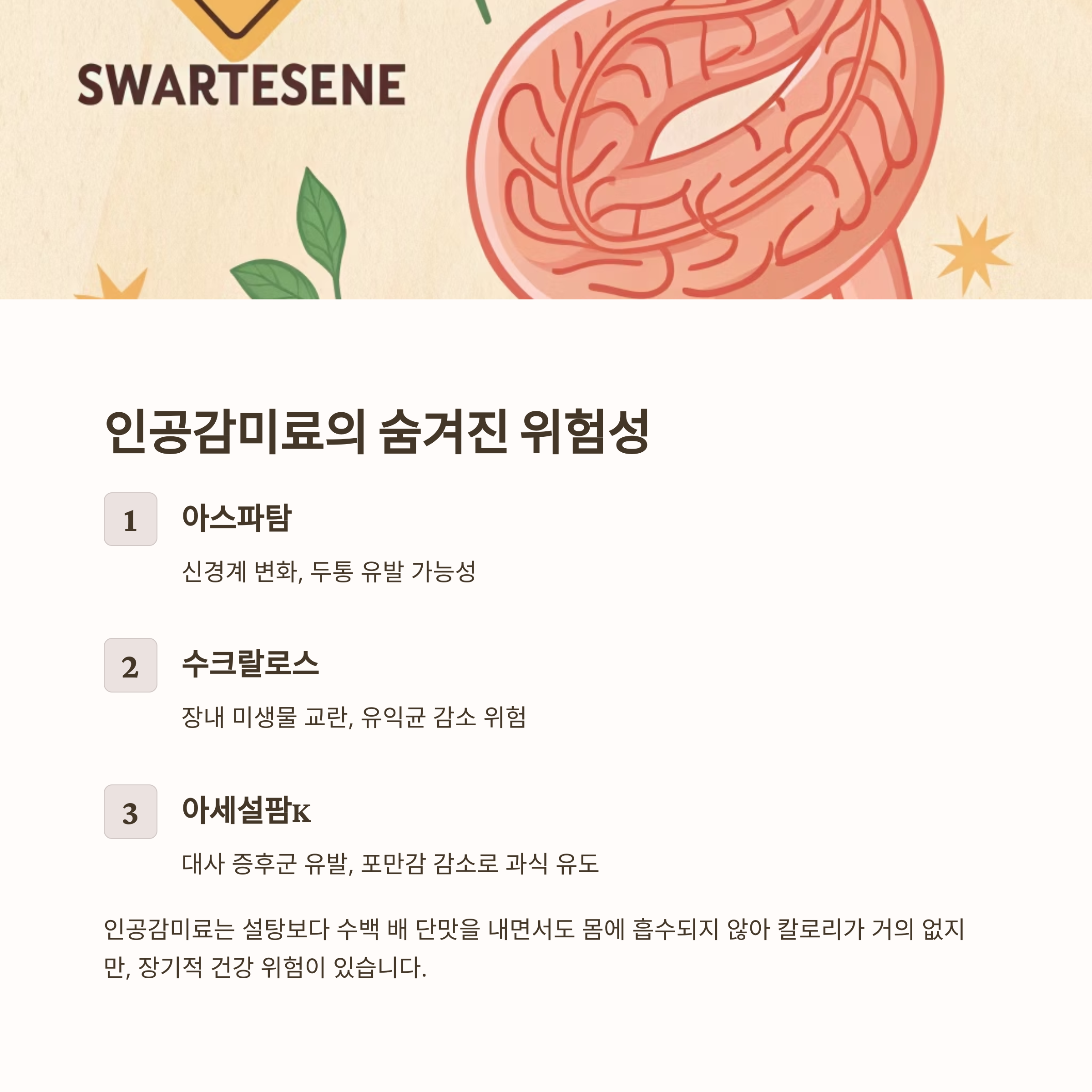 | 수크랄로스 | 장내 미생물 교란 | 유익균 감소 및 장 건강 저하 가능성 |
