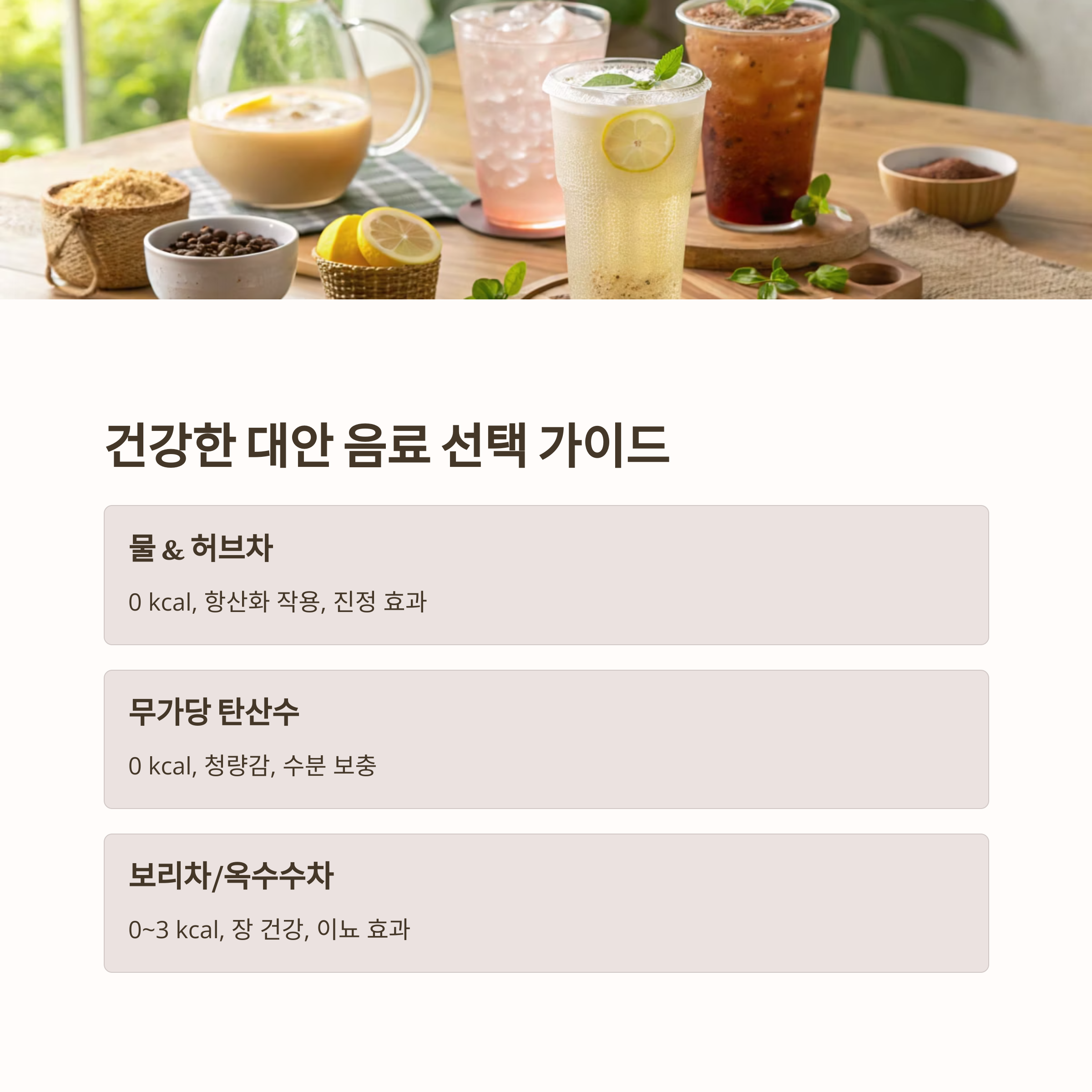 | 음료 유형 | 칼로리 | 장점 | 주의사항 |