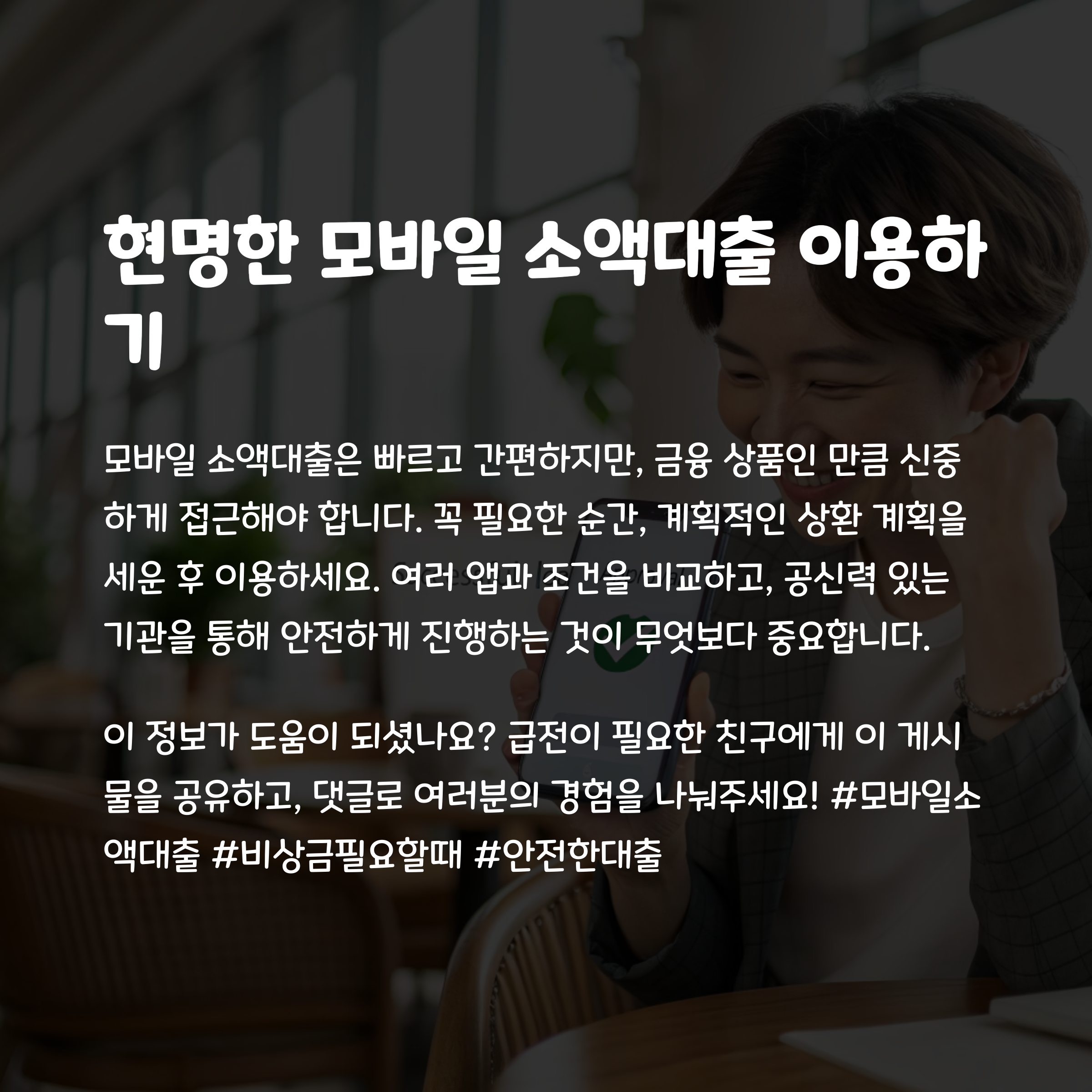 모바일 소액대출은 빠르고 간편하지만, 금융 상품인 만큼 신중하게 접근해야 해요. 꼭 필요한 순간, 계획적인 상환 계획을 세운 후 이용하세요. 여러 앱과 조건을 비교하고, 공신력 있는 기관을 통해 안전하게 진행하는 것이 무엇보다 중요합니다.