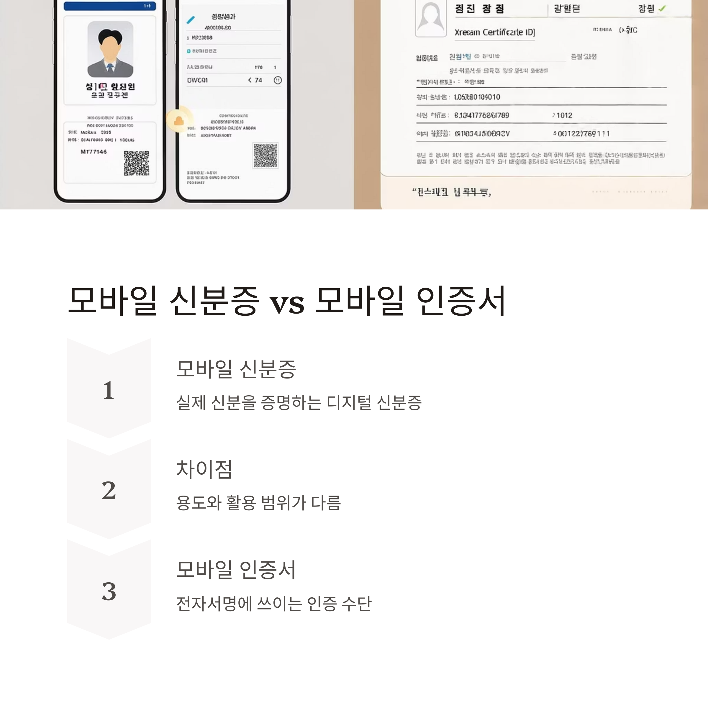 모바일 인증서는 전자서명에 쓰이는 인증 수단이고, 모바일 신분증은 실제 신분을 증명하는 디지털 신분증이에요.