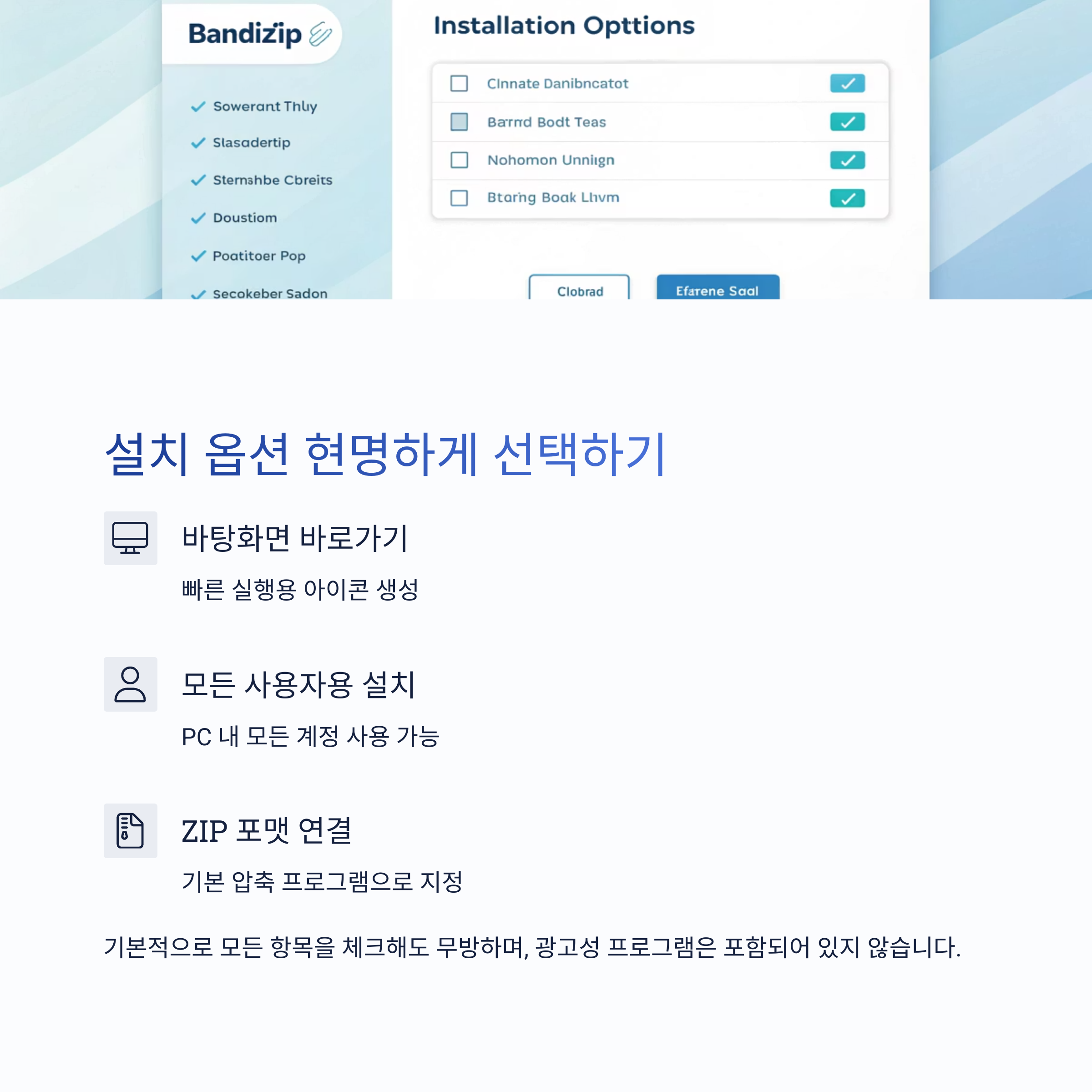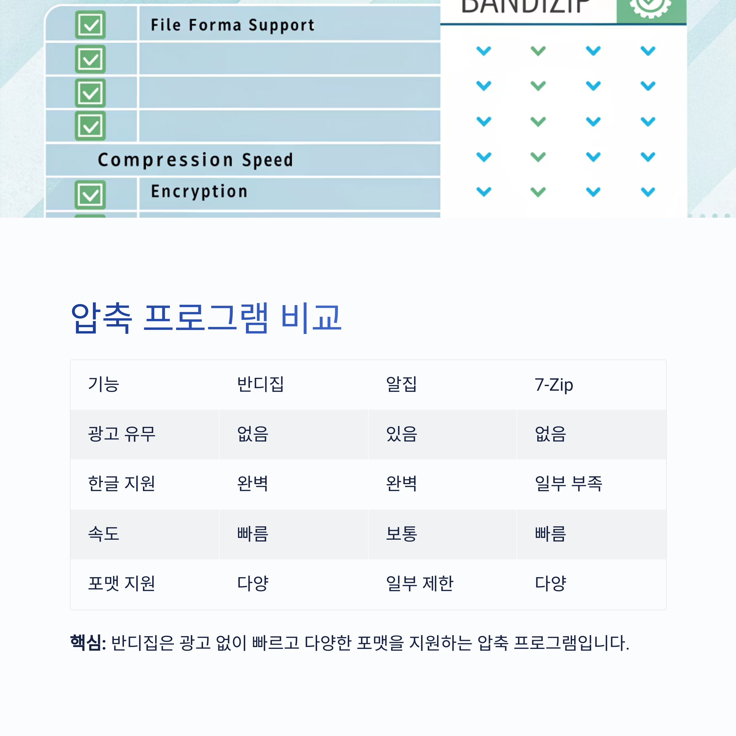 핵심: 반디집은 광고 없이 빠르고 다양한 포맷을 지원하는 압축 프로그램입니다.