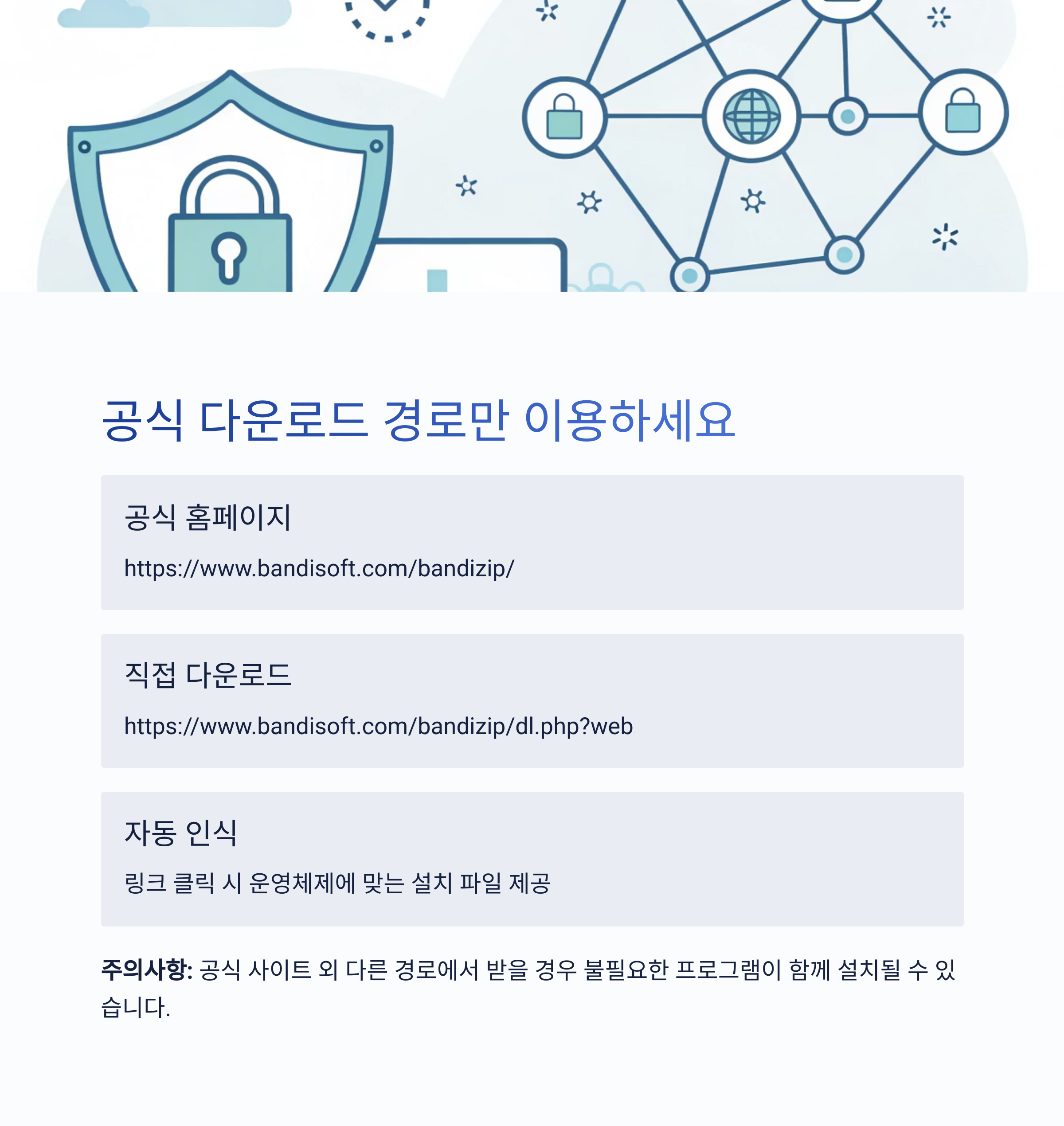 반디집은 공식 사이트 외 다른 경로에서 받을 경우 불필요한 프로그램이 함께 설치될 수 있습니다.