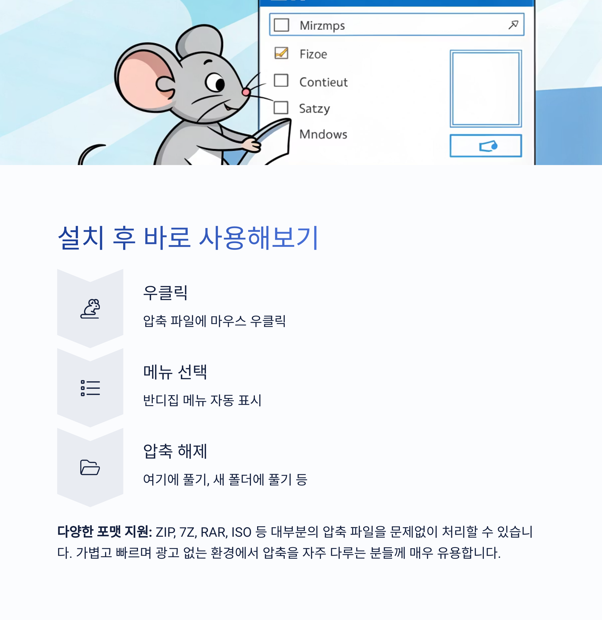 또한, 다양한 포맷(ZIP, 7Z, RAR, ISO 등)을 지원하므로 대부분의 압축 파일을 문제없이 처리할 수 있습니다.