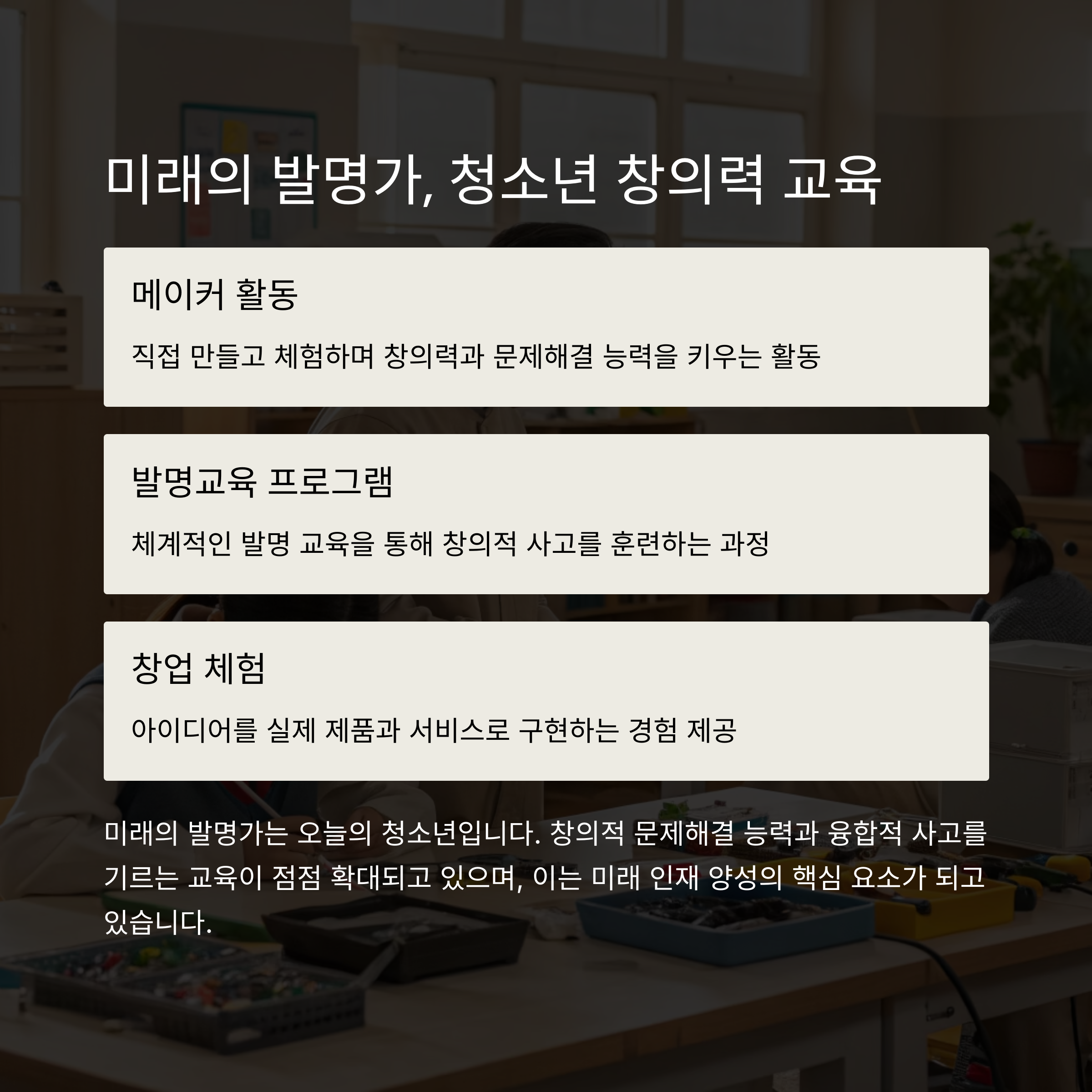 미래의 발명가는 청소년입니다. 창의적 문제해결 능력과 융합적 사고를 기르는 교육이 중요합니다. 메이커 활동, 발명교육 프로그램, 창업 체험 등이 점점 확대되고 있습니다.