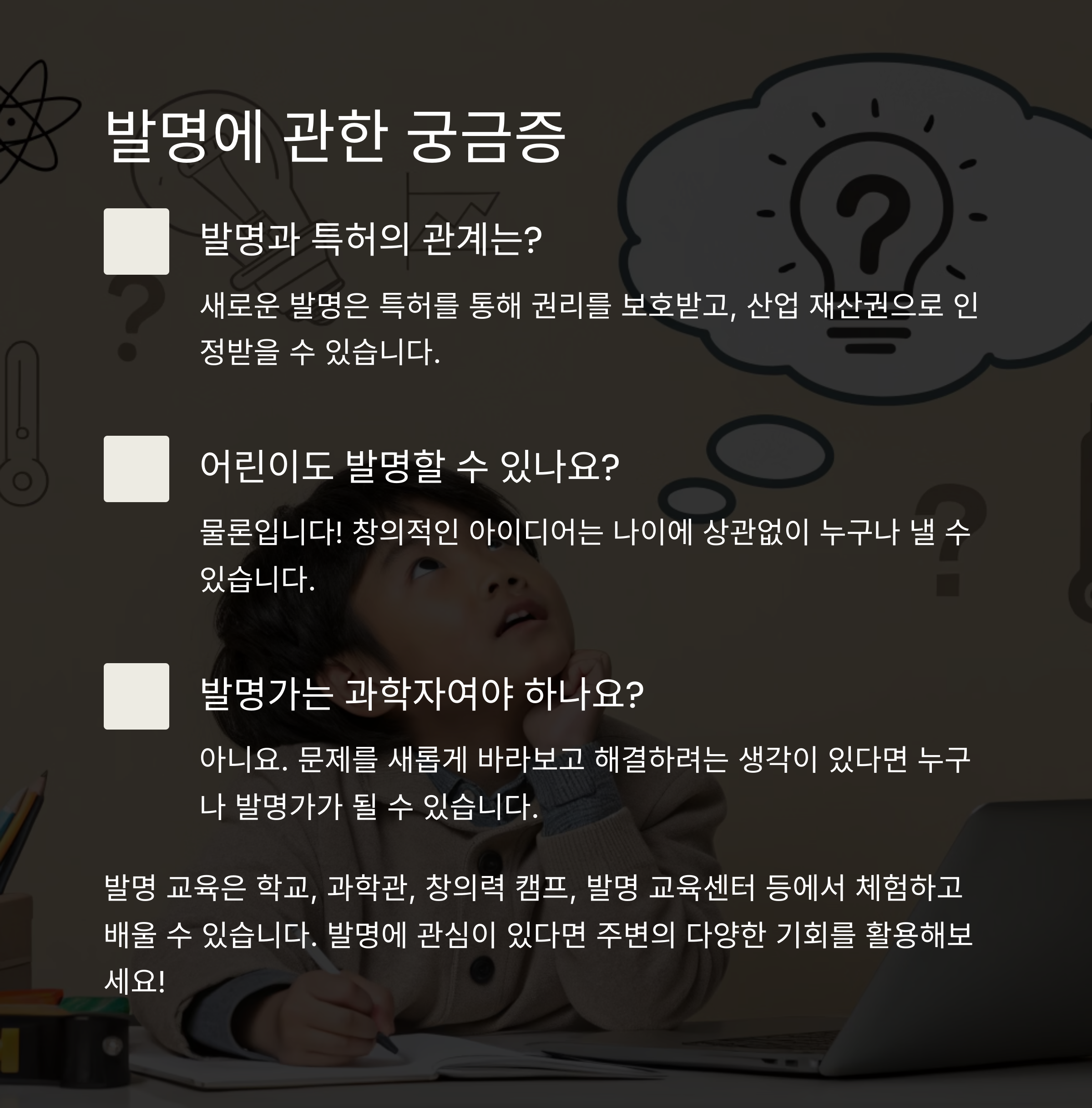 발명의 날은 우리 삶에 창의와 기술이 얼마나 중요한지를 다시금 생각하게 합니다. 발명은 개인의 아이디어에서 출발하지만, 사회 전체의 변화를 이끄는 원동력이 됩니다. 청소년부터 성인까지, 우리 모두가 창의적 사고를 실천할 수 있는 환경을 만들어 더 나은 미래를 함께 설계해보아요.