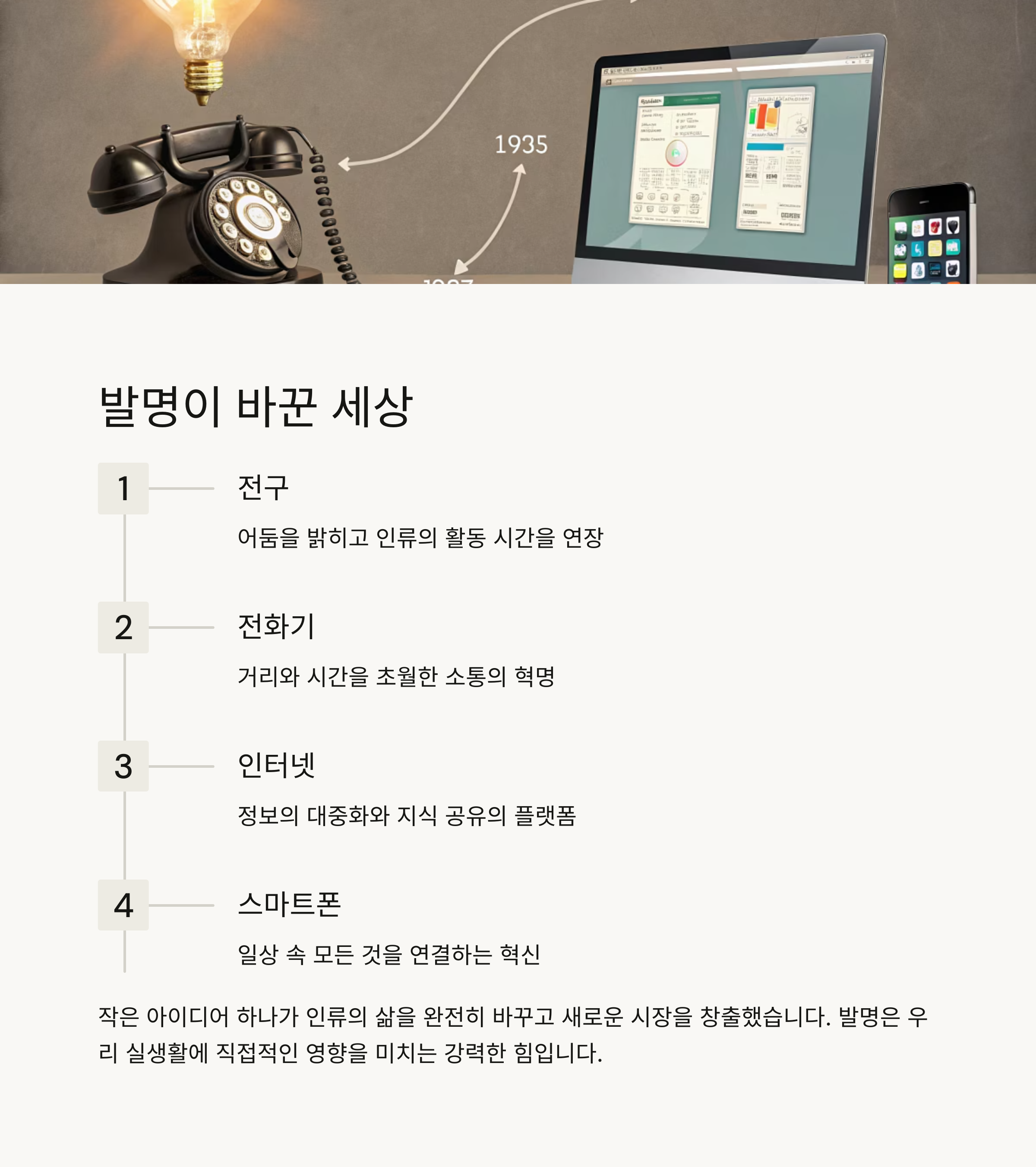 전구, 전화기, 인터넷, 스마트폰까지. 작은 아이디어 하나가 인류의 삶을 바꾸고 새로운 시장을 만들어낸 대표적인 예들입니다. 발명은 실생활에 직접적인 영향을 미치는 힘입니다.