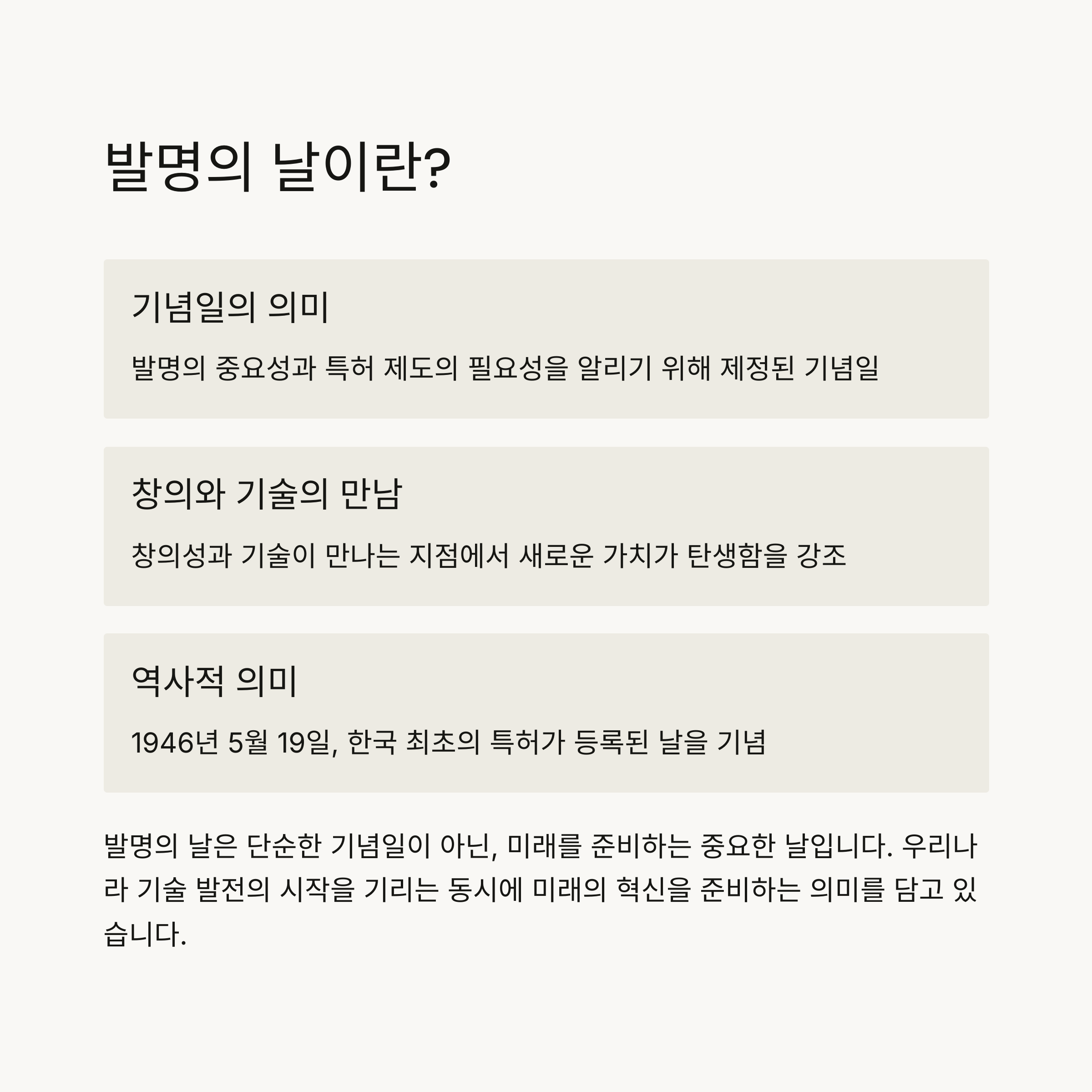발명의 날은 발명의 중요성과 특허 제도의 필요성을 알리기 위해 제정된 기념일입니다. 창의성과 기술이 만나는 지점에서 새로운 가치가 탄생한다는 점을 강조하는 의미를 담고 있습니다.