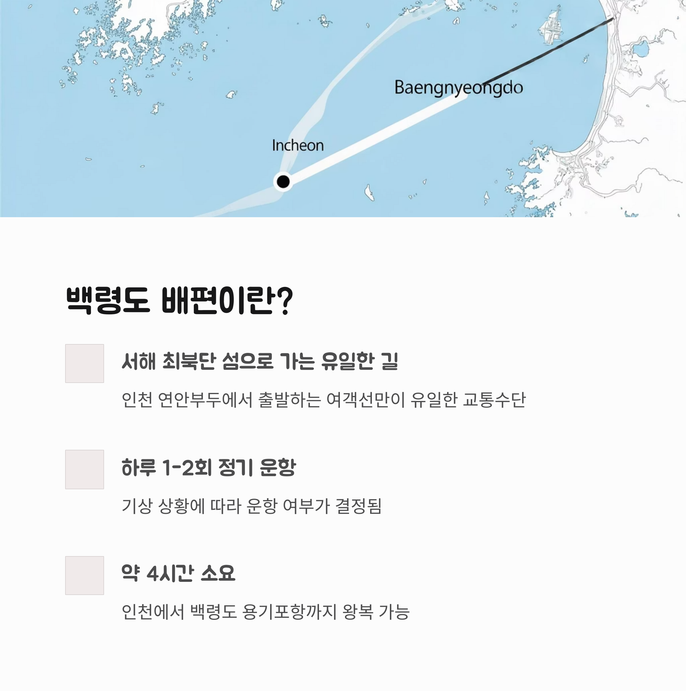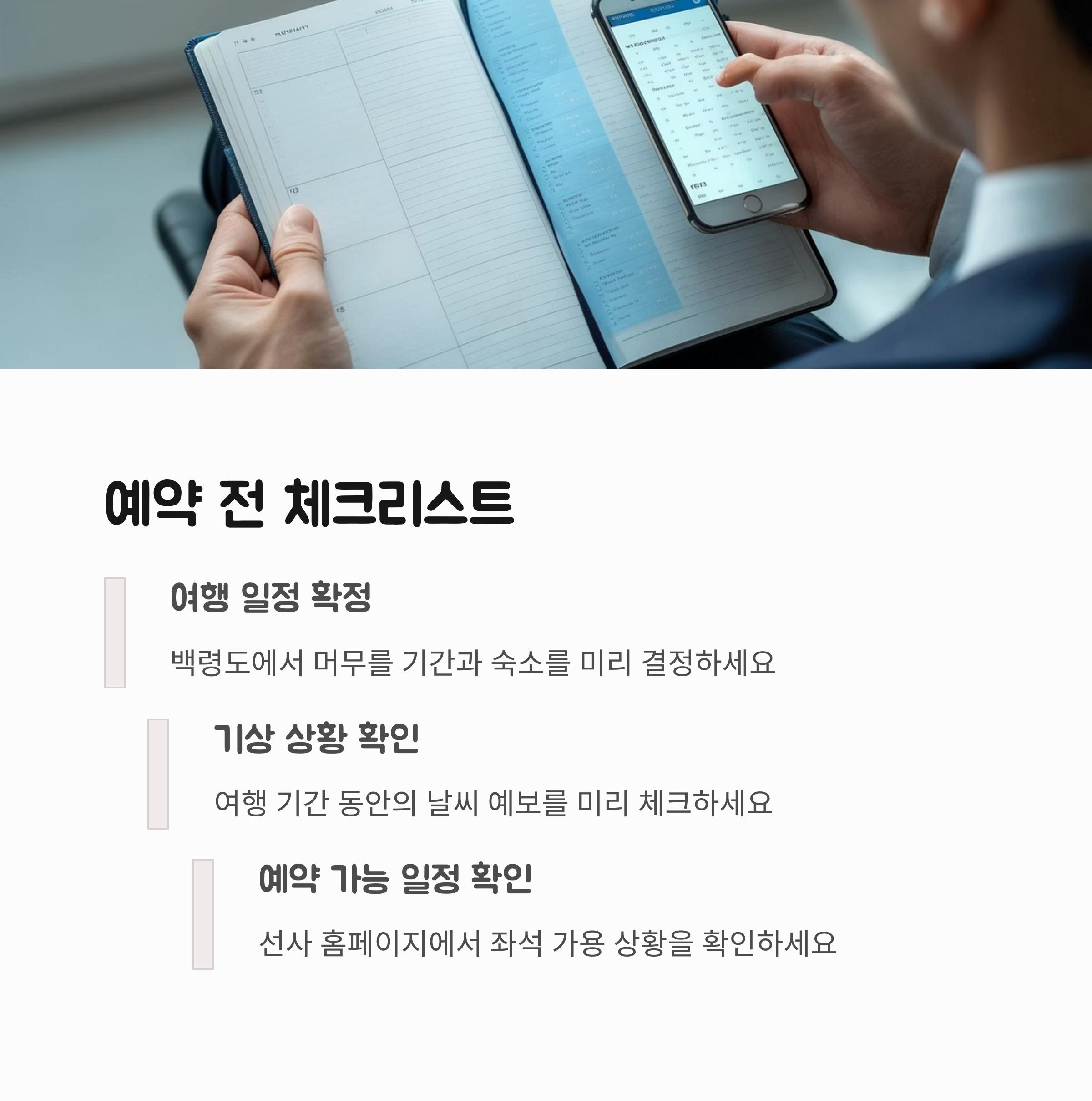 백령도는 배편으로만 접근 가능한 만큼 사전 준비가 매우 중요합니다. 특히 여름 성수기에는 좌석이 빠르게 매진되기 때문에, 예약 오픈 즉시 예매를 권장드려요. 출항 당일에는 여유 있게 선착장에 도착하시는 것도 잊지 마세요.