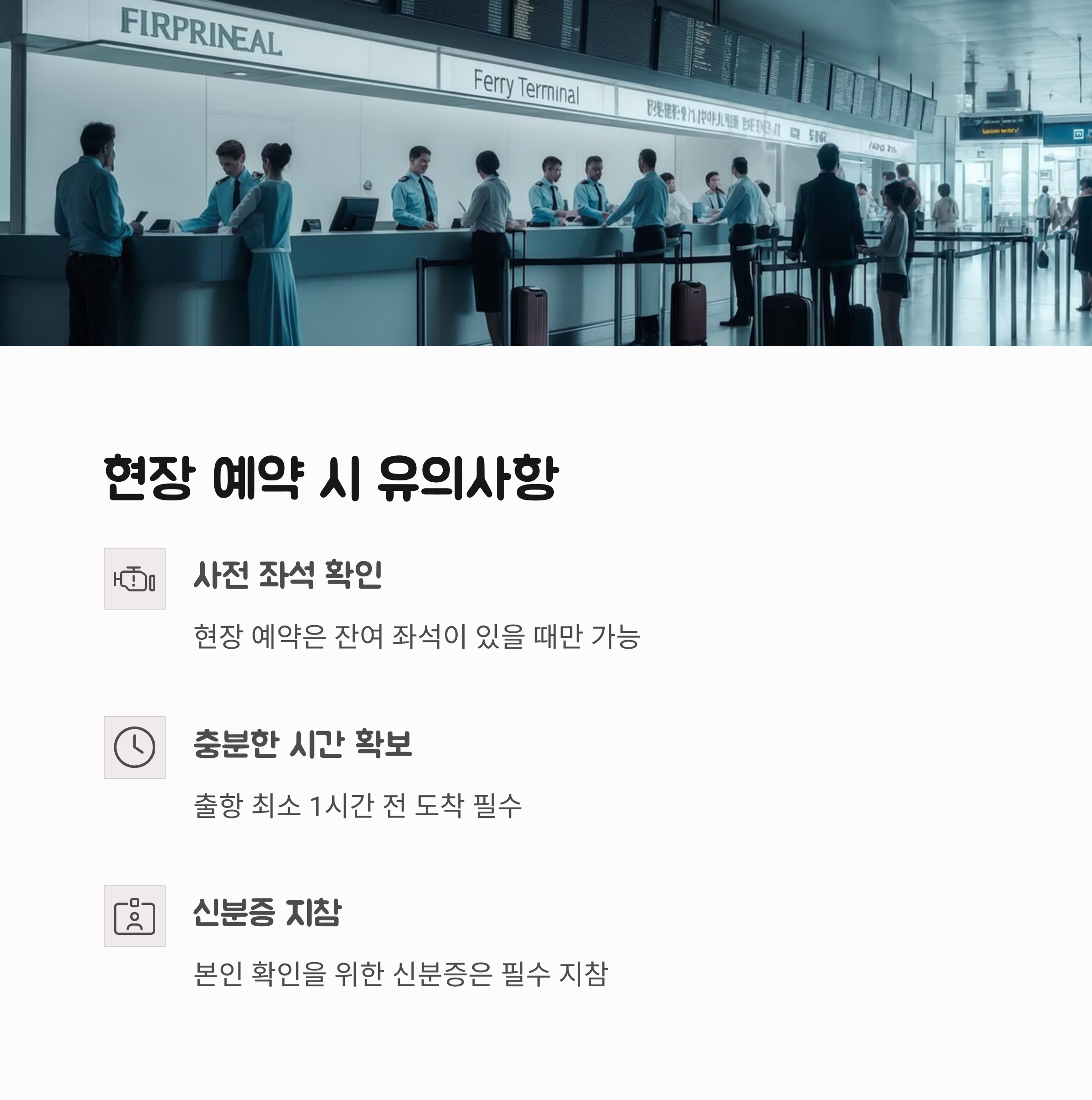 현장에서 직접 구매할 수 있는 좌석은 매우 한정적이에요. 특히 주말이나 공휴일에는 현장 구매가 거의 불가능할 수 있어요. 당일 탑승을 원하신다면 최소 1시간 이상 여유를 두고 도착하셔야 하고, 신분증을 반드시 지참하셔야 해요.