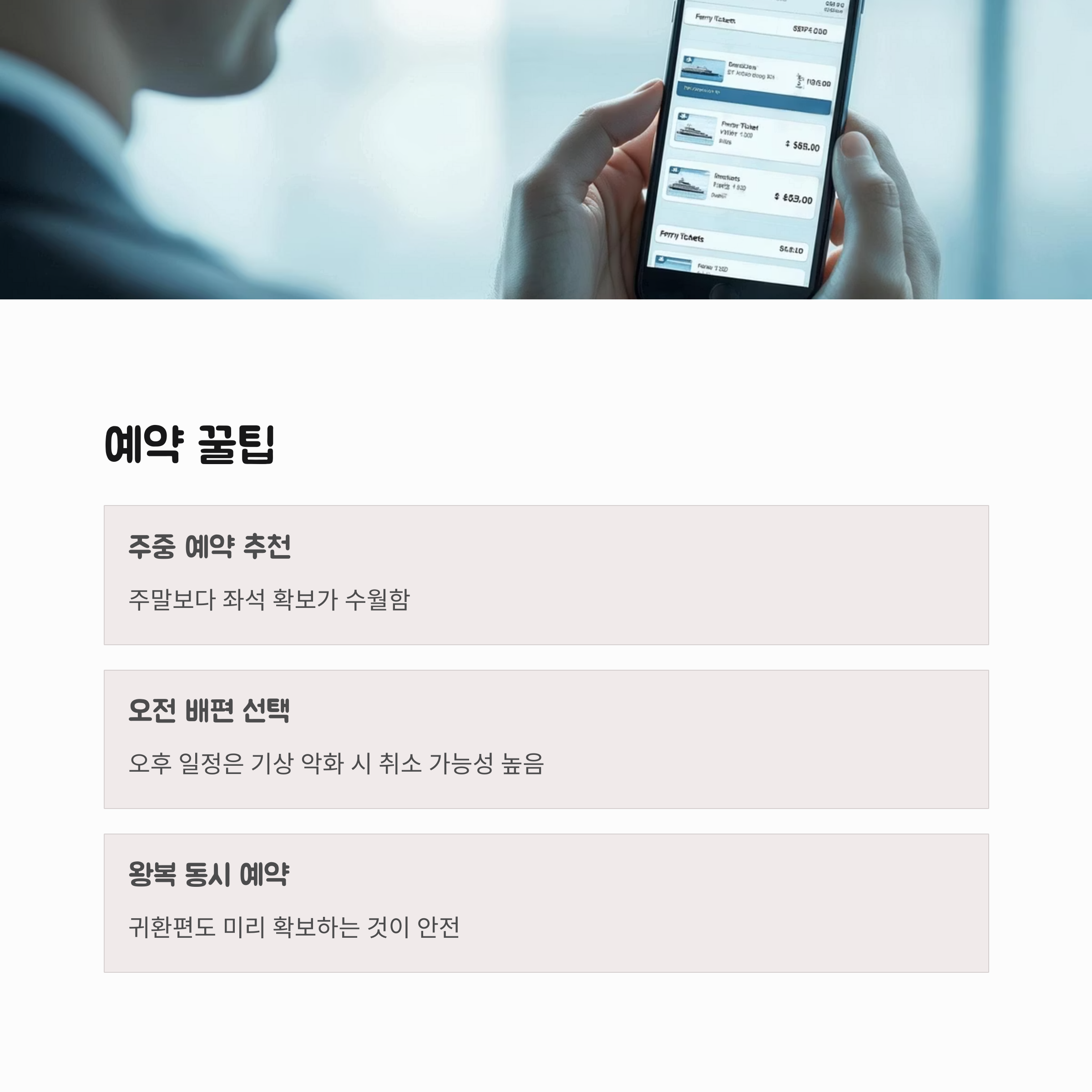 선사 홈페이지 또는 여객터미널 통합 예약 사이트에서 원하는 날짜와 시간을 선택한 후, 승선 인원을 입력하고 결제까지 완료하면 예약이 끝나요. 특히 성수기나 주말은 빠르게 매진되니 서둘러 예약하는 게 중요해요.