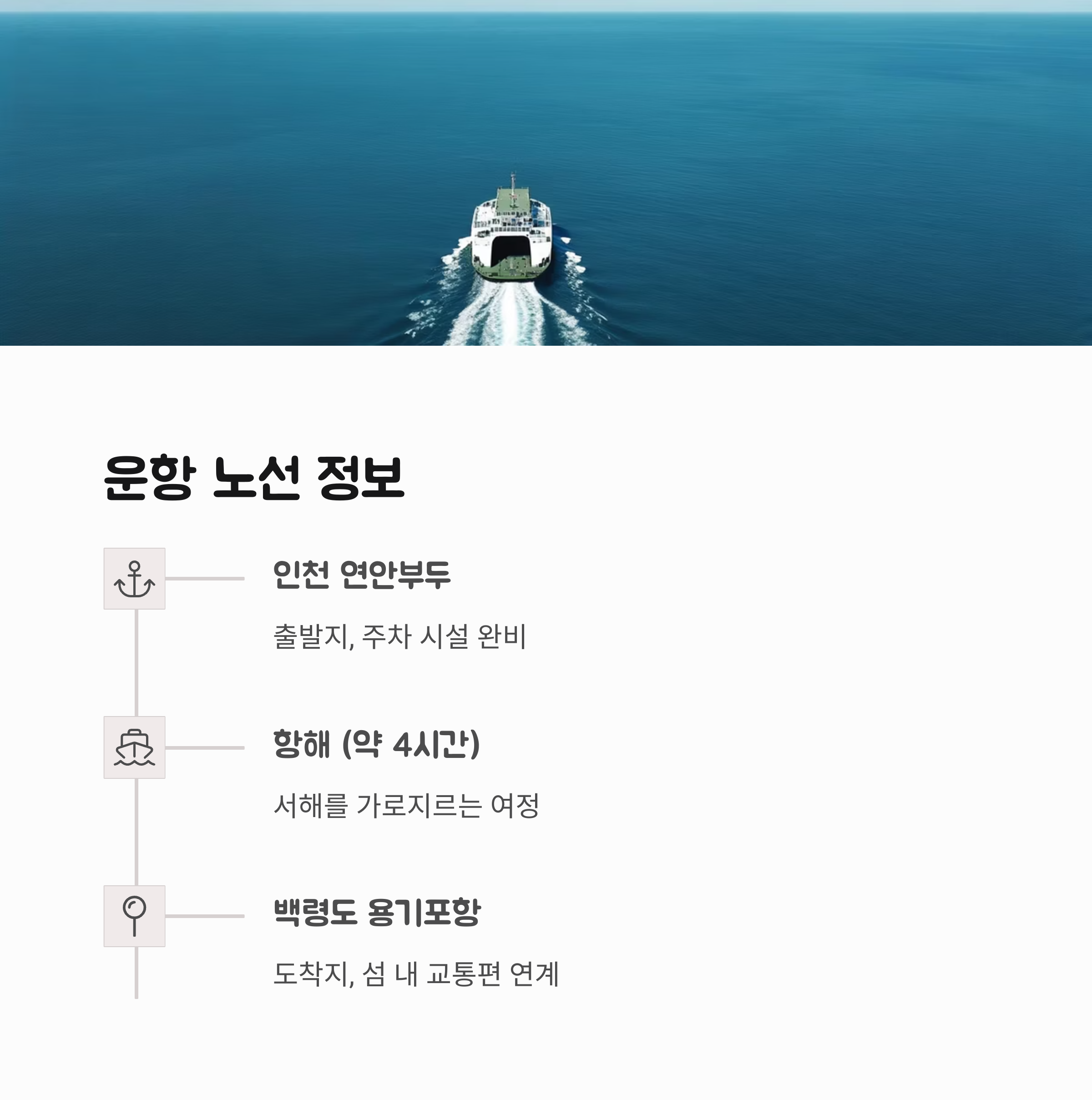 백령도는 인천 연안부두에서 출항하는 여객선을 통해 접근할 수 있는 섬이에요. 이 배편은 하루 1~2회 왕복 운항되며, 기상과 선사 일정에 따라 유동적이에요. 섬 특성상 사전에 뱃시간을 파악하고 예약을 진행해야 원활한 여행이 가능하답니다.