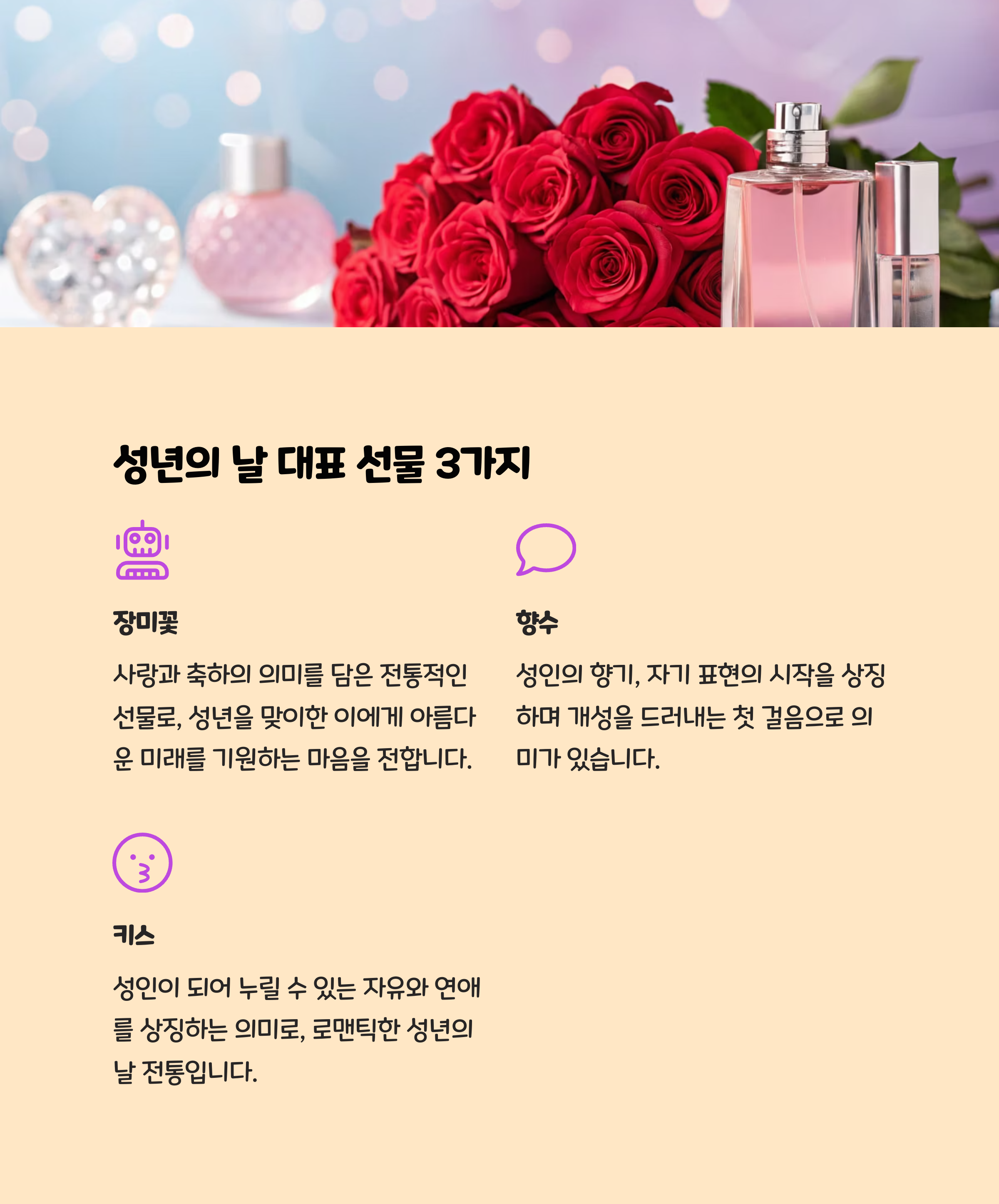 장미, 향수, 키스는 성년의 날 대표 상징이에요.