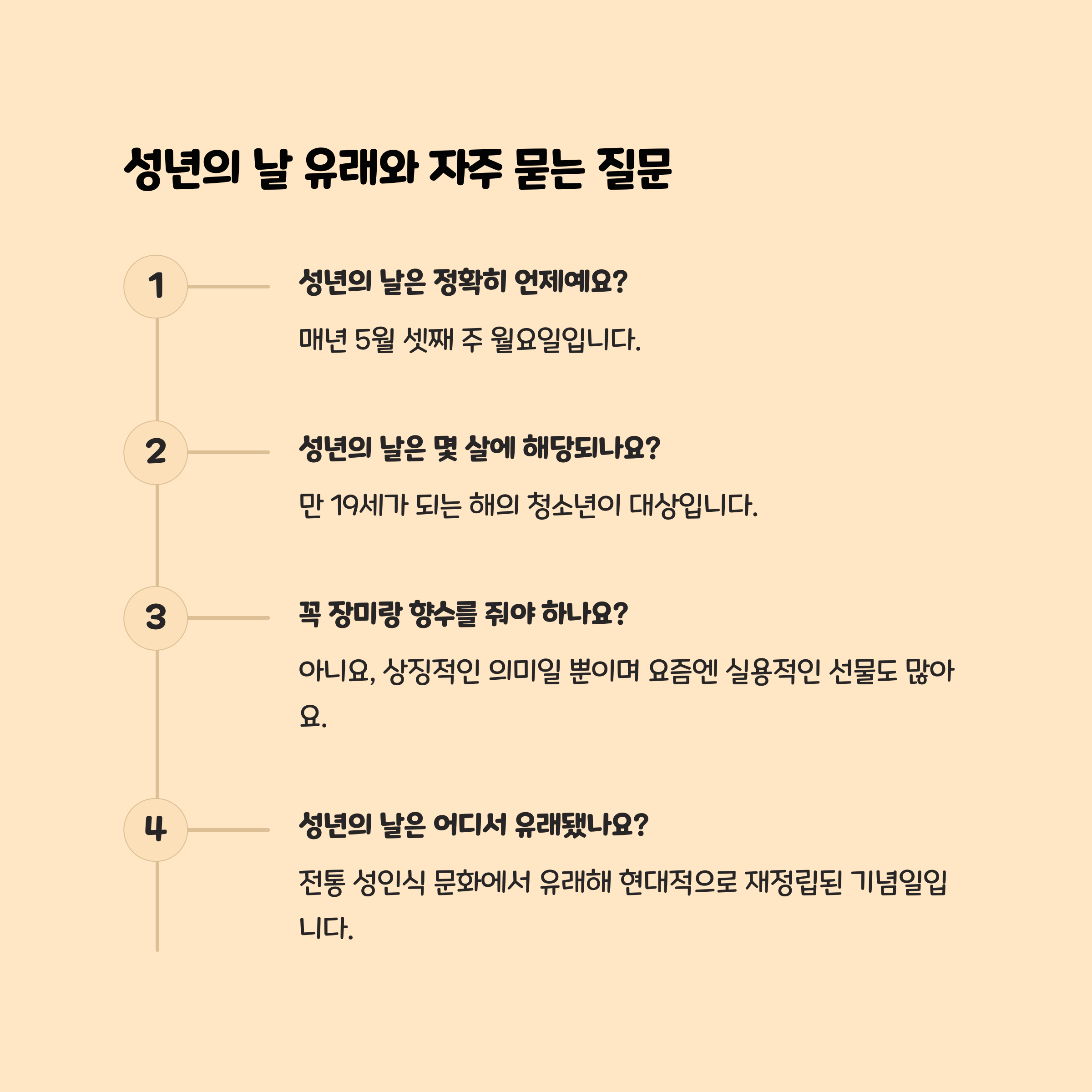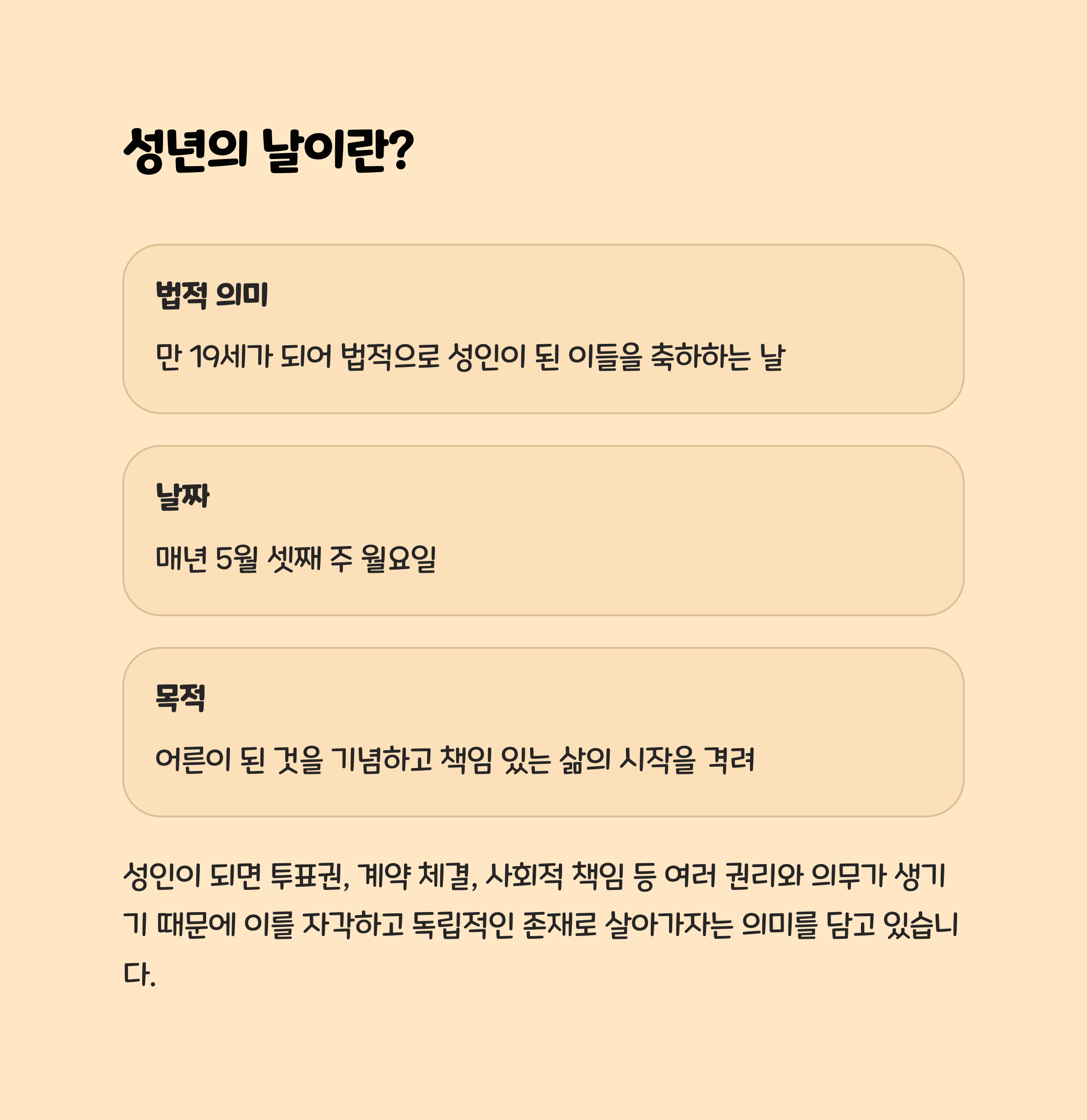 성인이 되면 투표권, 계약 체결, 사회적 책임 등 여러 권리와 의무가 생기기 때문에 이를 자각하고 독립적인 존재로 살아가자는 의미에서 축하하는 날로 자리 잡았어요.