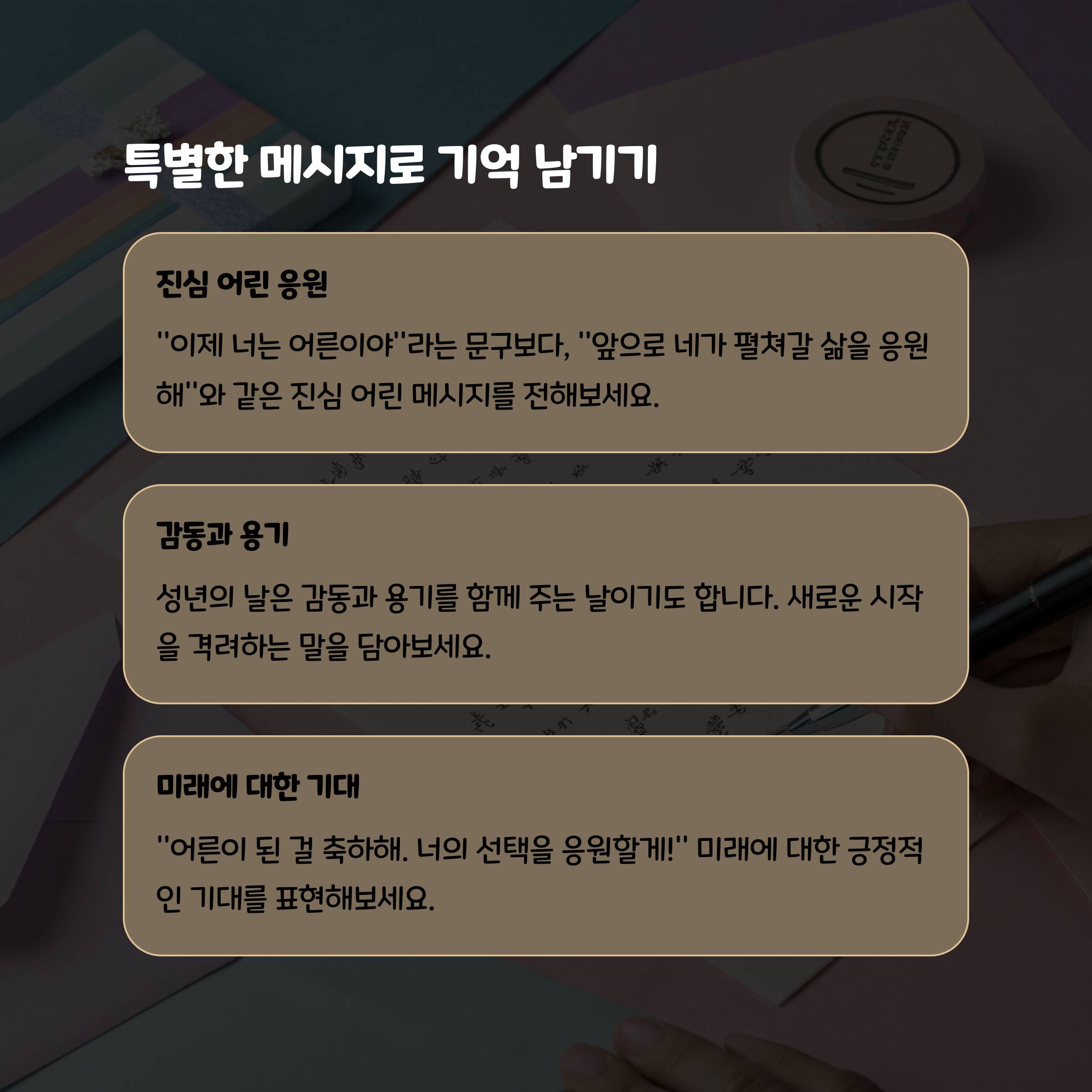 “어른이 된 걸 축하해. 너의 선택을 응원할게!”처럼 응원하는 말을 전해보세요.
