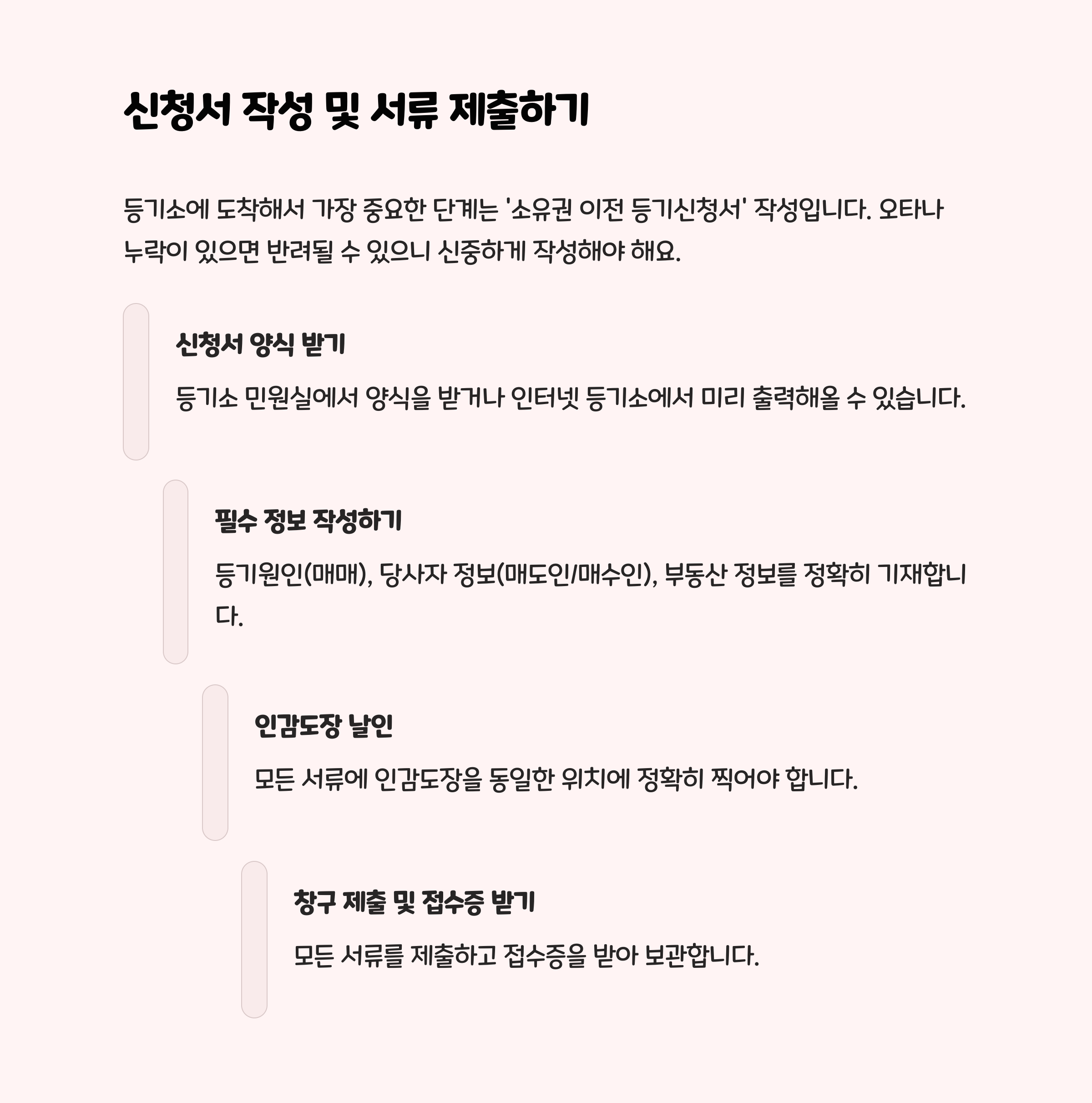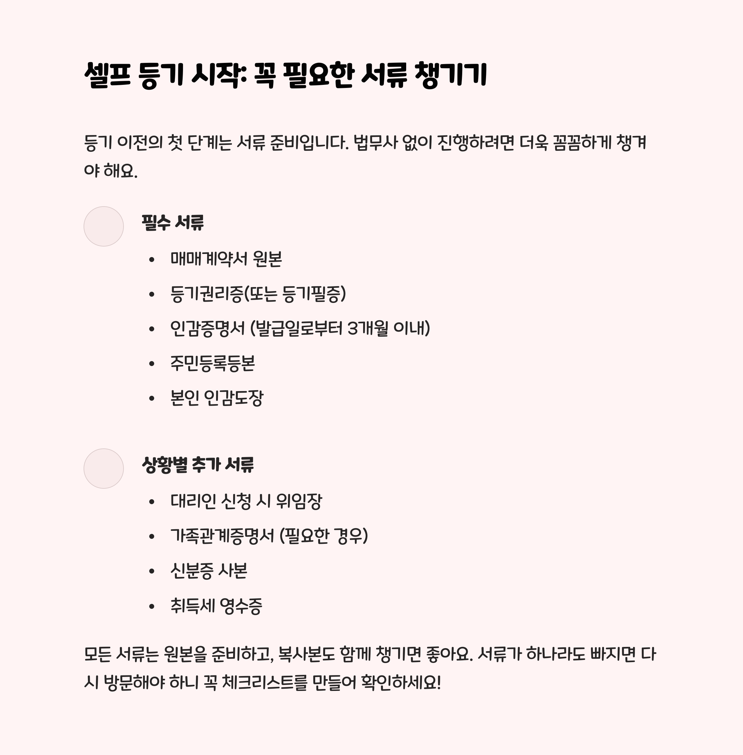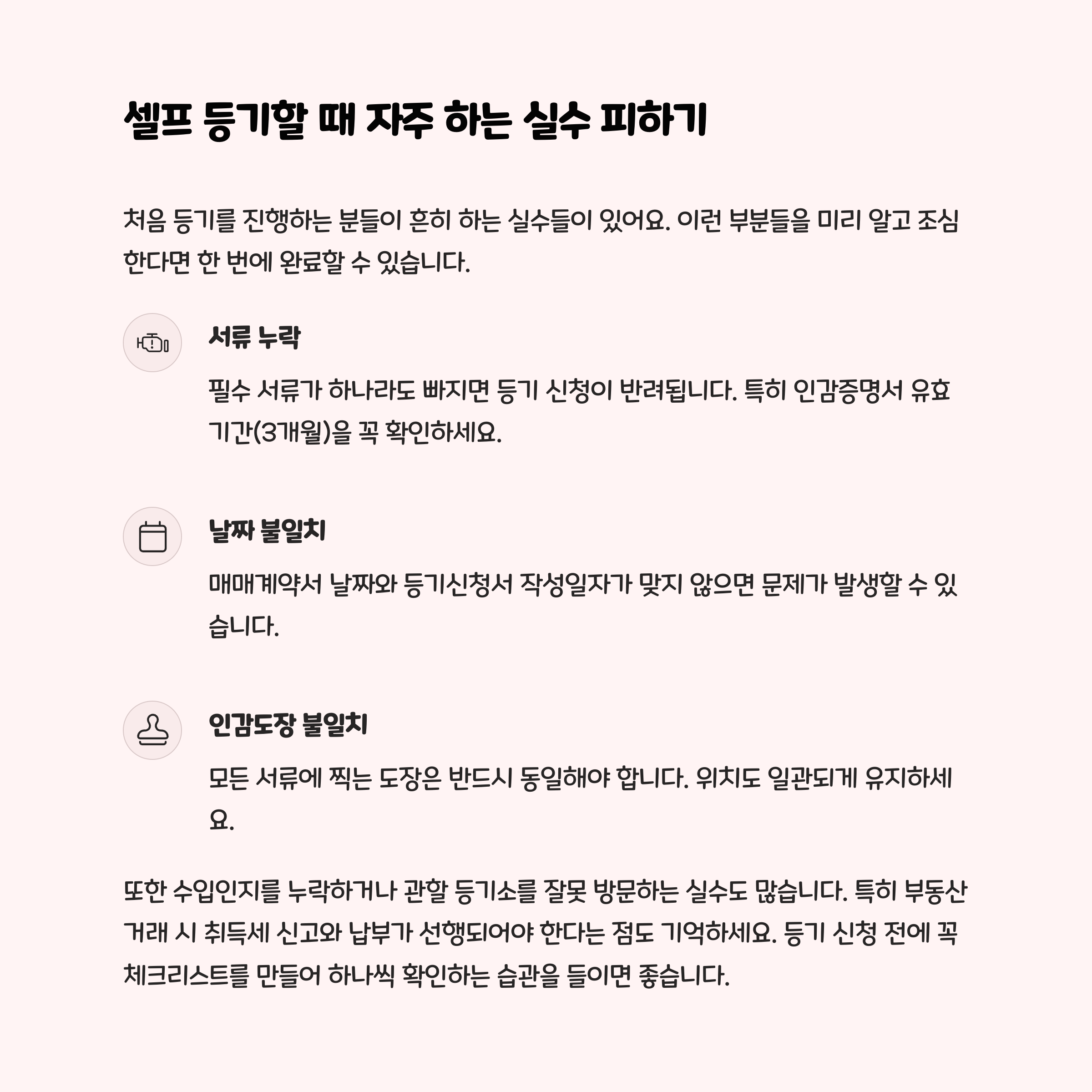 초보자들이 셀프 등기하면서 가장 많이 하는 실수는 바로 서류 누락이에요. 또 날짜를 잘못 기입하거나 인감이 다른 서류랑 일치하지 않으면 다시 와야 하죠. 그래서 꼭 제출 전에 한 번 더 체크하는 습관이 필요해요.