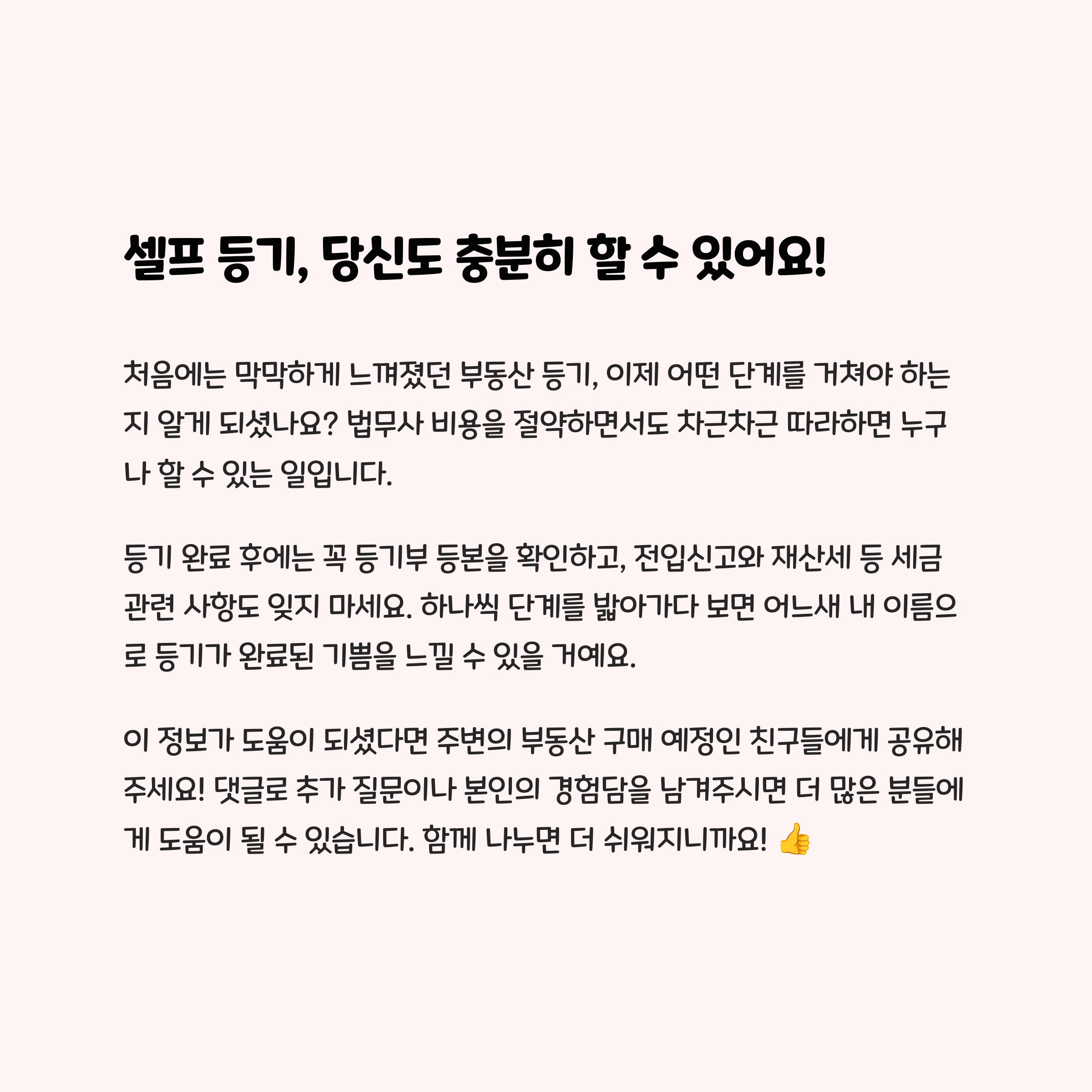 셀프 부동산 등기 이전, 처음엔 막막하게 느껴질 수도 있지만 한 걸음씩 따라가다 보면 분명히 해낼 수 있어요. 저도 그랬거든요. 중요한 건 서류 하나하나 꼼꼼하게 챙기고, 절차를 놓치지 않는 거예요. 만약 오늘 이 글을 읽고 ‘나도 한번 해볼까?’ 하는 생각이 들었다면, 이미 반은 성공한 거예요. 직접 해본 경험담이 궁금하시거나, 궁금한 점이 있다면 댓글로 꼭 남겨주세요. 함께 나눌수록 쉬워지니까요 :)