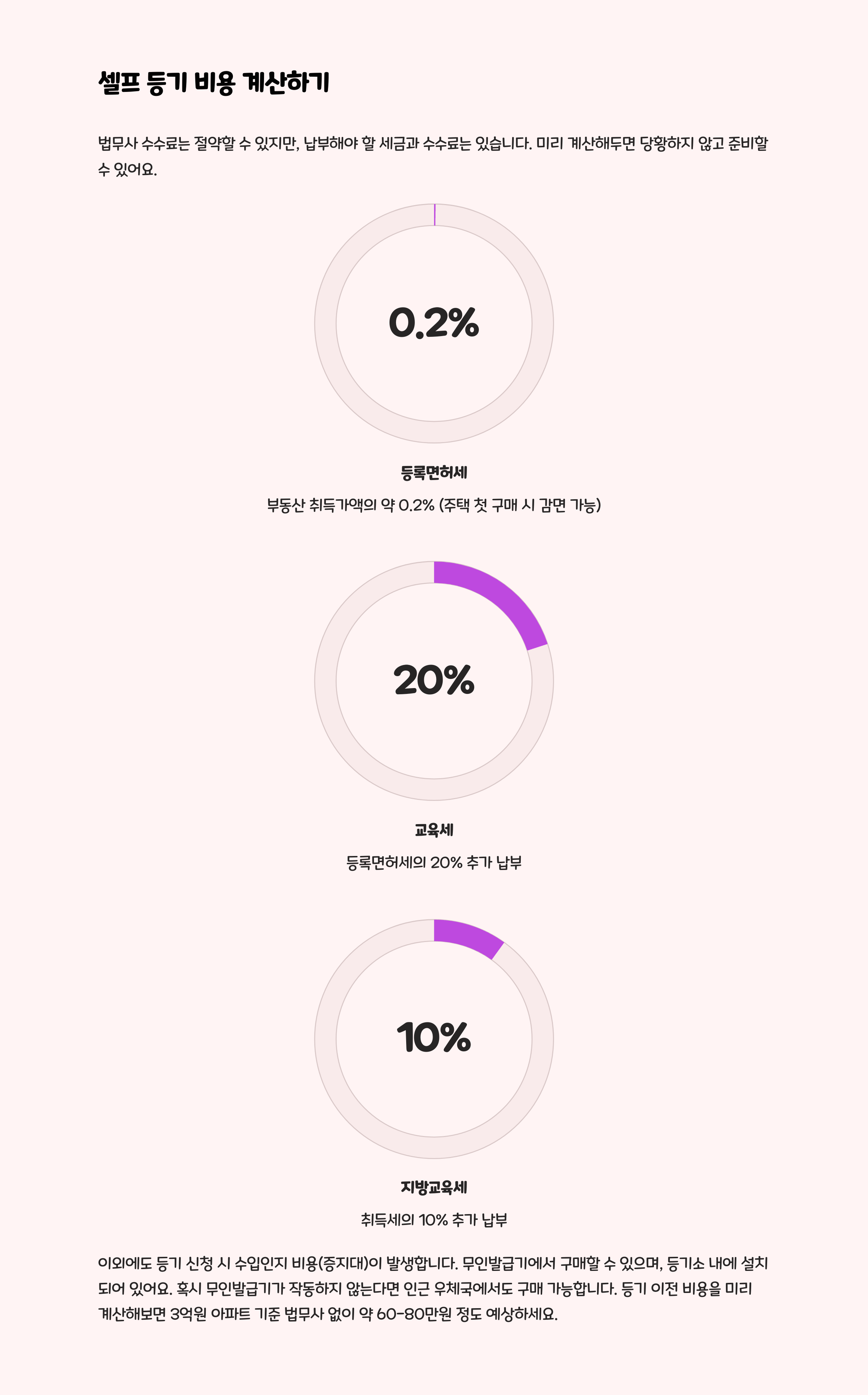 셀프 등기를 고민하는 이유 중 하나가 바로 비용 때문이죠. 법무사를 쓰면 수수료가 수십만 원인데, 내가 하면 그걸 아낄 수 있거든요. 그렇다고 해서 비용이 전혀 없는 건 아니에요. 등록면허세, 취득세, 교육세, 증지대 등은 어쨌든 납부해야 하니까요.