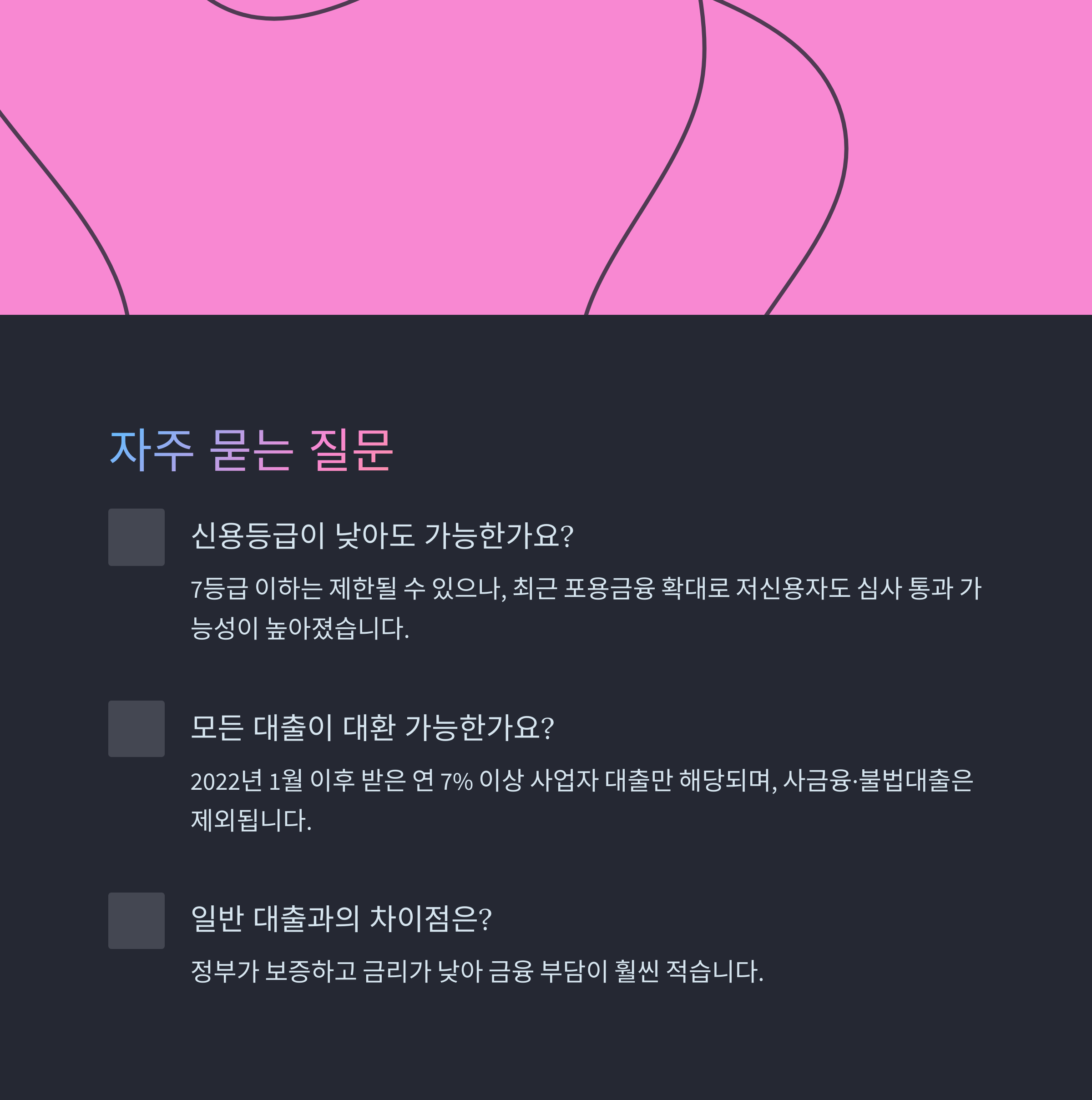 - 대환 대상: 2022년 1월 이후 받은 연 7% 이상 민간 금융기관 사업자 대출