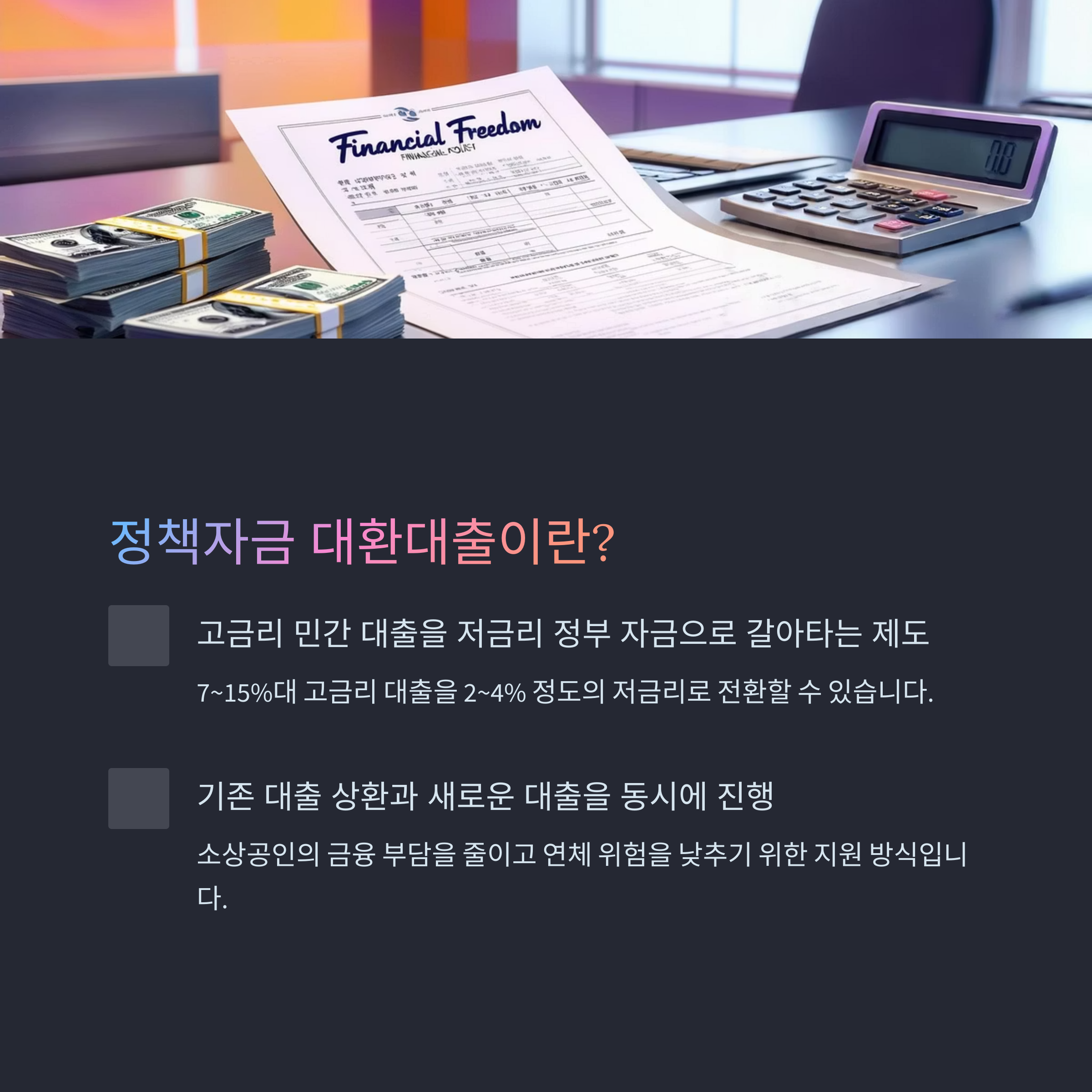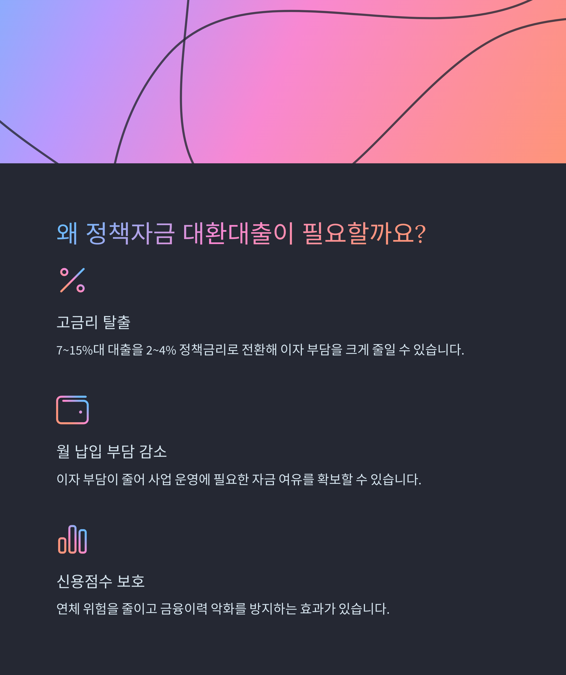 정책자금 대환대출은 고금리 민간 금융사 대출을 저금리의 정부 정책자금으로 갈아탈 수 있게 해주는 제도예요. 소상공인의 금융 부담을 줄이고, 연체 위험을 낮추기 위한 지원 방식으로, 기존 대출을 상환하면서 동시에 새로 대출받는 형태입니다.
