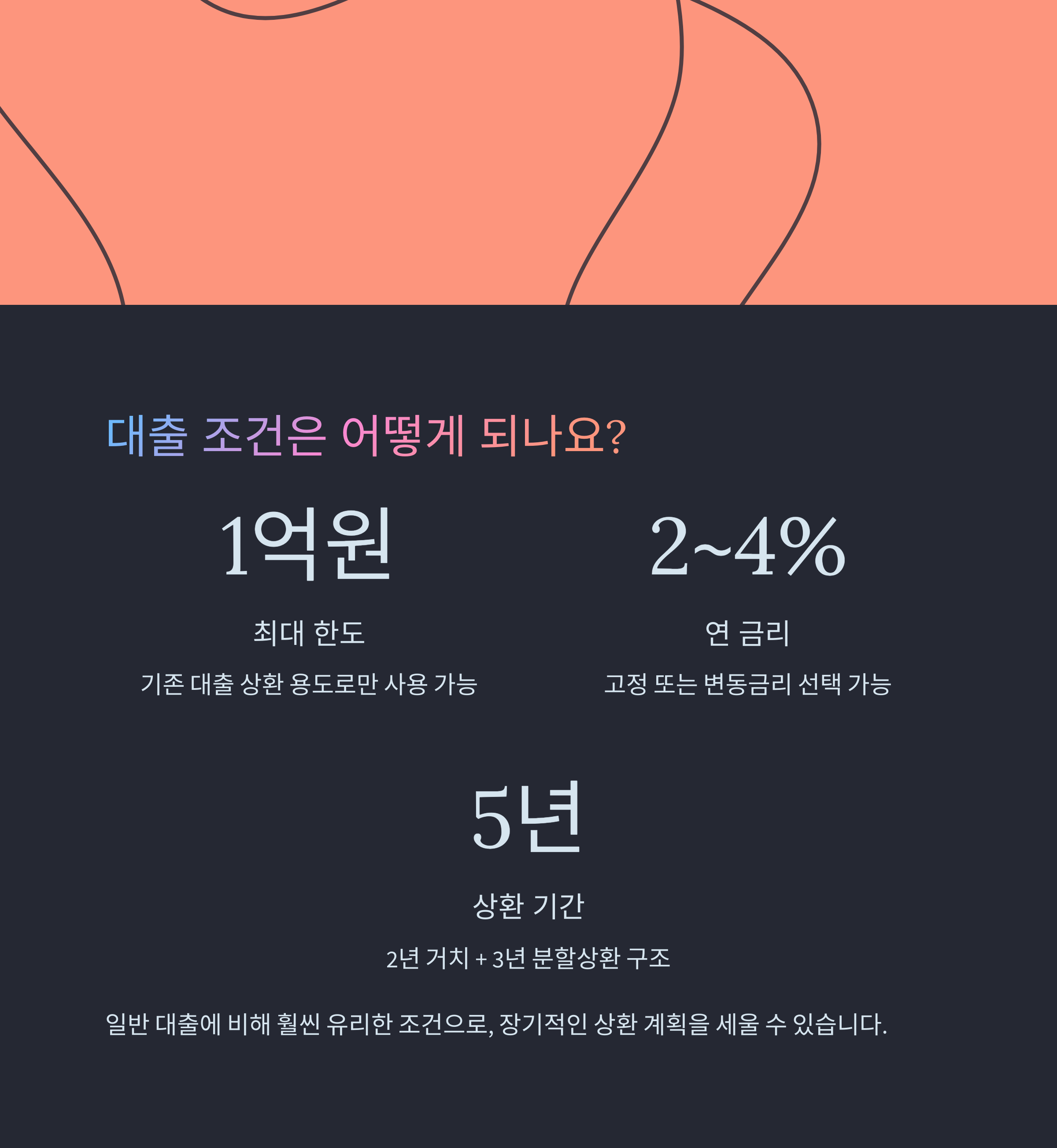 - 한도: 최대 1억원 (기존 대출 상환용도)
