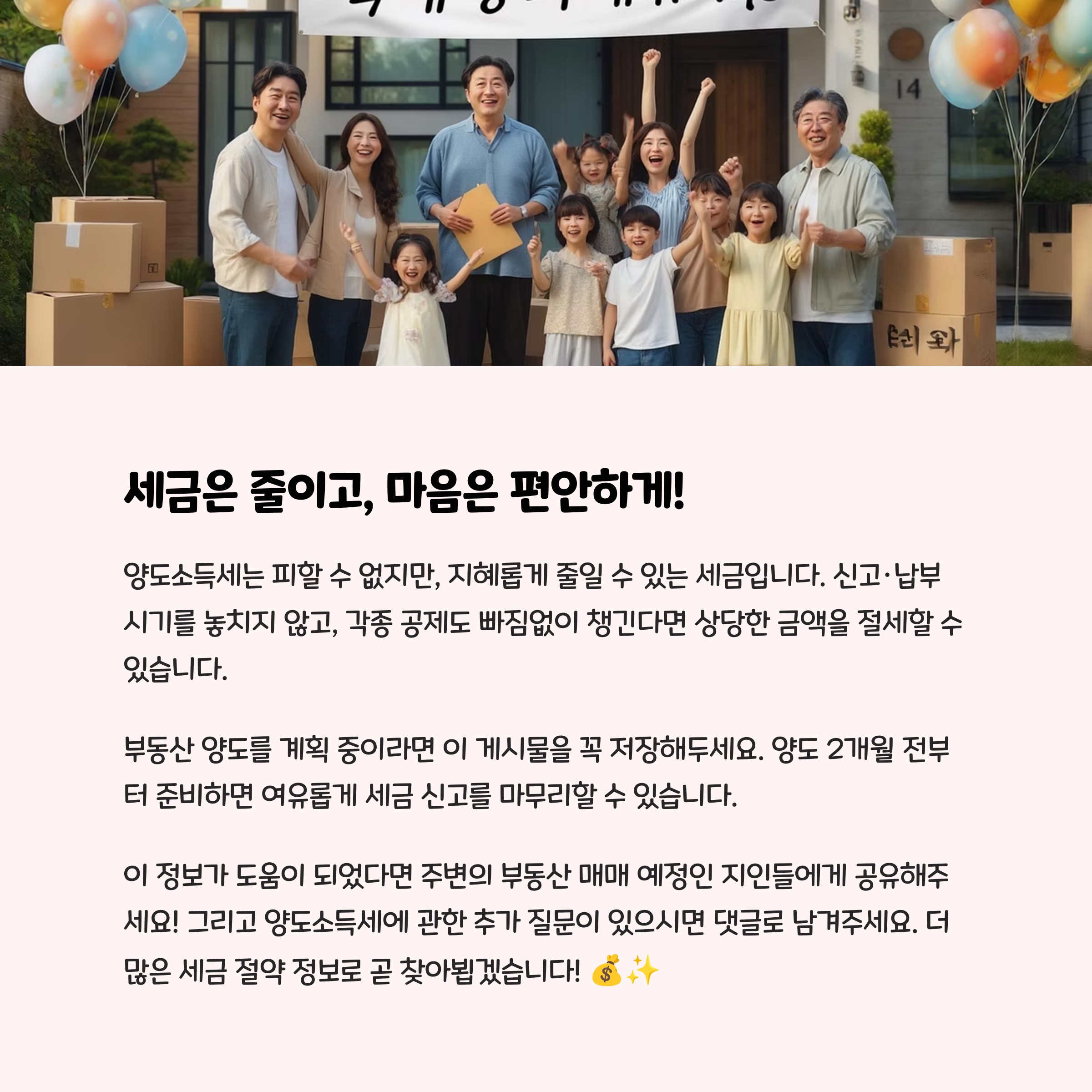 양도소득세는 피할 수는 없어도, 지혜롭게 줄일 수 있는 세금입니다. 신고·납부 시기 놓치지 않고, 각종 공제도 빠짐없이 챙긴다면 얼마든지 절세 가능해요. 부동산 양도 계획 중이라면 이번 글을 참고해 세무 실수 없이 마무리해보세요. 궁금한 점이 있다면 댓글로 함께 나눠요. 알면 돈 되는 세금 정보, 다음에도 쉽게 알려드릴게요! 💡