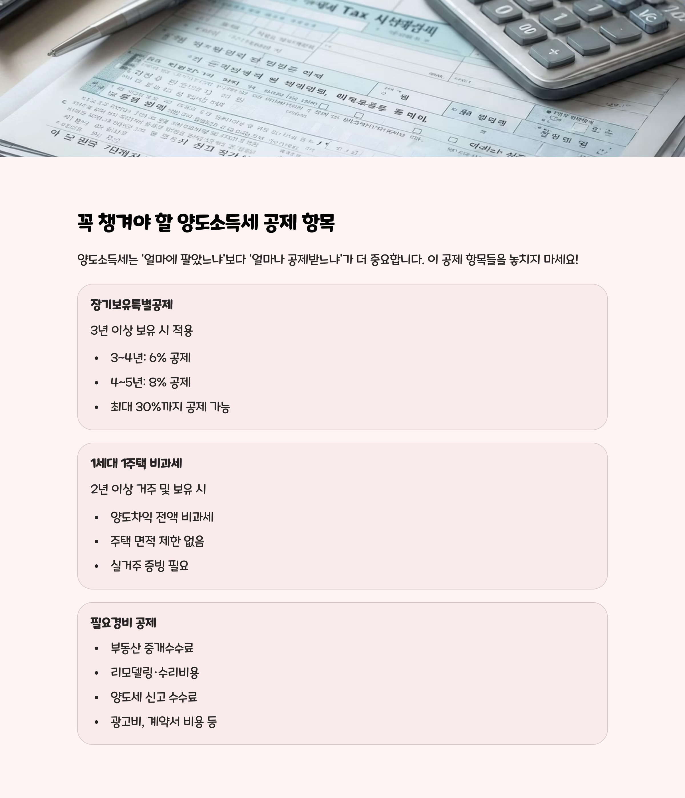 양도소득세는 '얼마에 팔았느냐'보다 '얼마나 공제받느냐'가 더 중요할 수 있어요. 아래 공제 항목들을 빠짐없이 챙기세요.