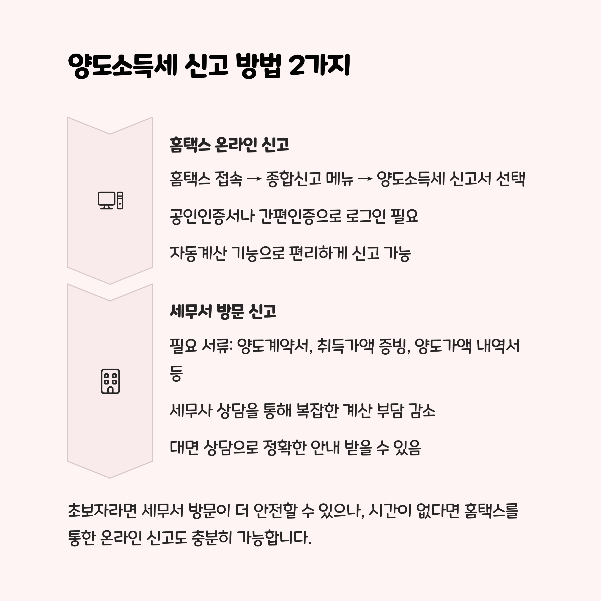 소액이거나 단순한 거래라면 홈택스로 충분하지만, 다주택자·장기보유공제·분할 양도 등 복잡한 경우는 세무사 도움을 받는 것이 안전합니다.