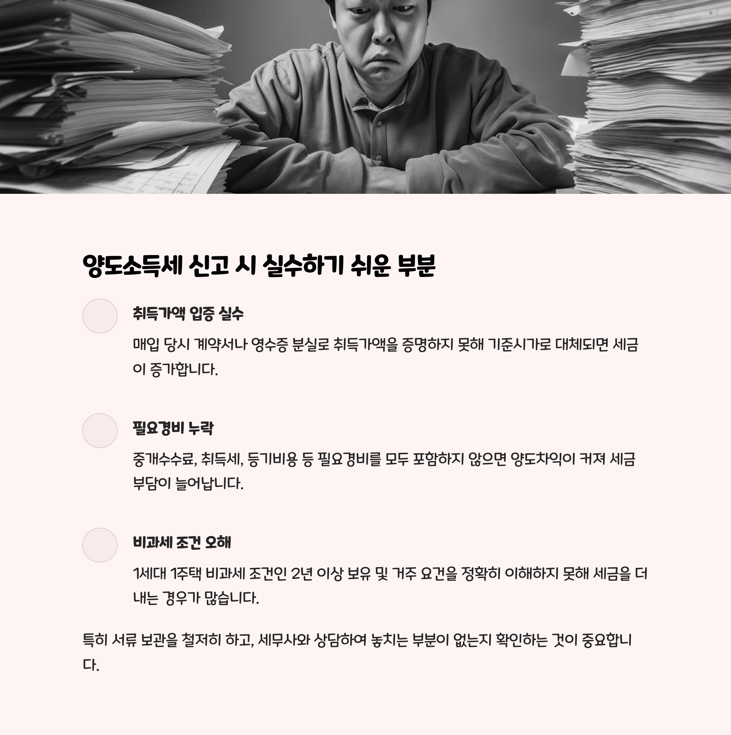 안녕하세요! 부동산 매매로 처음 양도소득세를 마주하게 된 직장인 김○○입니다. 집은 팔았는데 '신고 기한 놓쳐서 가산세', '공제 빠뜨려서 세금 더 내는' 분들 정말 많더라고요. 그래서 제가 직접 겪은 경험과 세무사 상담으로 배운 양도세 신고 실수 줄이는 핵심 팁들을 정리해봤어요. 부동산 양도 예정이거나 이미 거래한 분들께 큰 도움이 될 거예요!