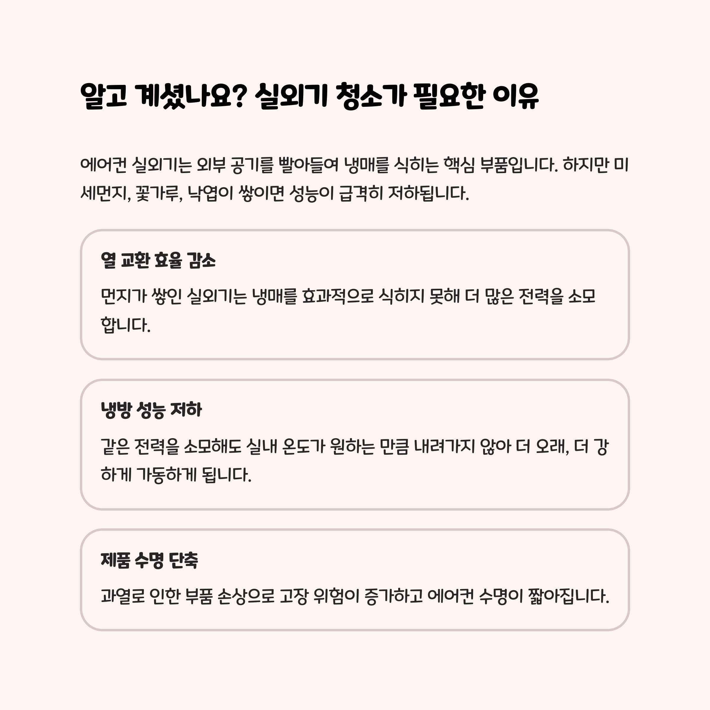 최소 3개월에 한 번, 특히 여름철 에어컨 사용 전후에는 필수입니다. 실외 환경이 나쁜 곳은 더 자주 해주면 좋아요.