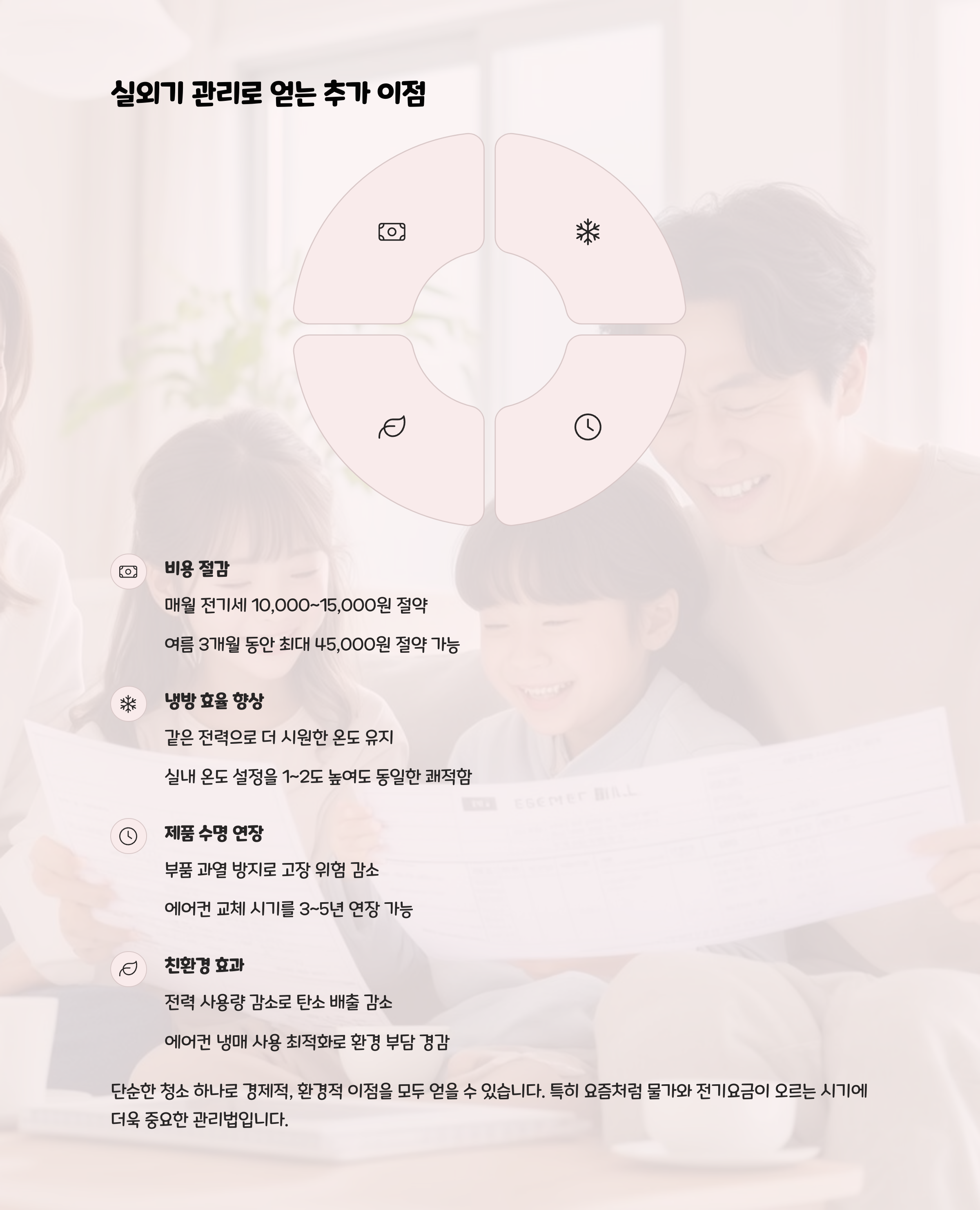 보시다시피, 실외기 청소만 해도 월 전기세가 30~40% 가까이 절약될 수 있어요. 단순한 유지관리 하나로 이 정도 차이라면, 안 할 이유가 없겠죠?