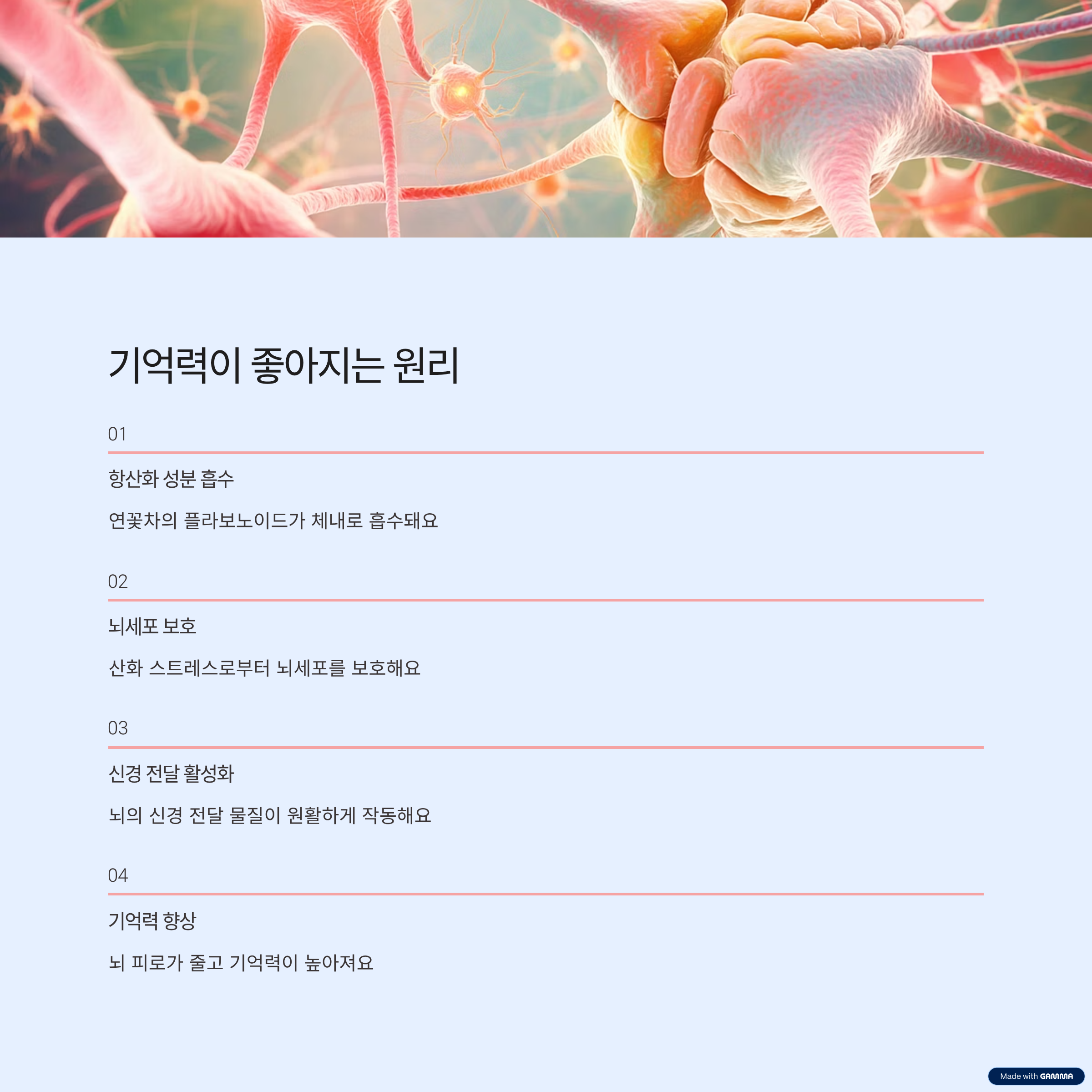 연꽃차에는 플라보노이드와 같은 항산화 성분이 풍부하게 들어 있어요. 이 성분들이 뇌세포의 산화를 막아주고, 신경 전달을 원활하게 도와준다고 해요. 즉, 뇌의 피로를 줄이고 기억력을 높이는 데 간접적으로 기여한다는 거죠.