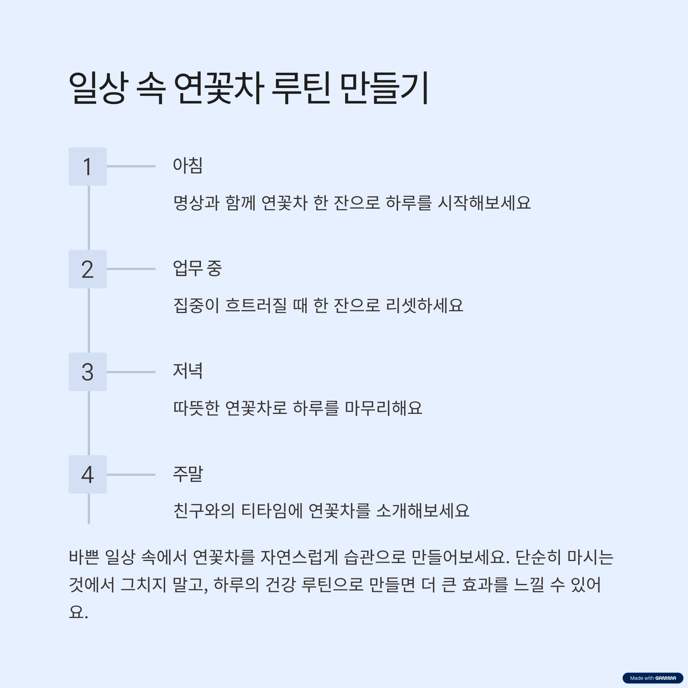바쁜 일상 속에서 연꽃차를 자연스럽게 습관으로 만들기 위해선 몇 가지 팁이 필요해요. 단순히 마시는 것에서 그치지 말고, 하루의 루틴으로 만들어보세요.