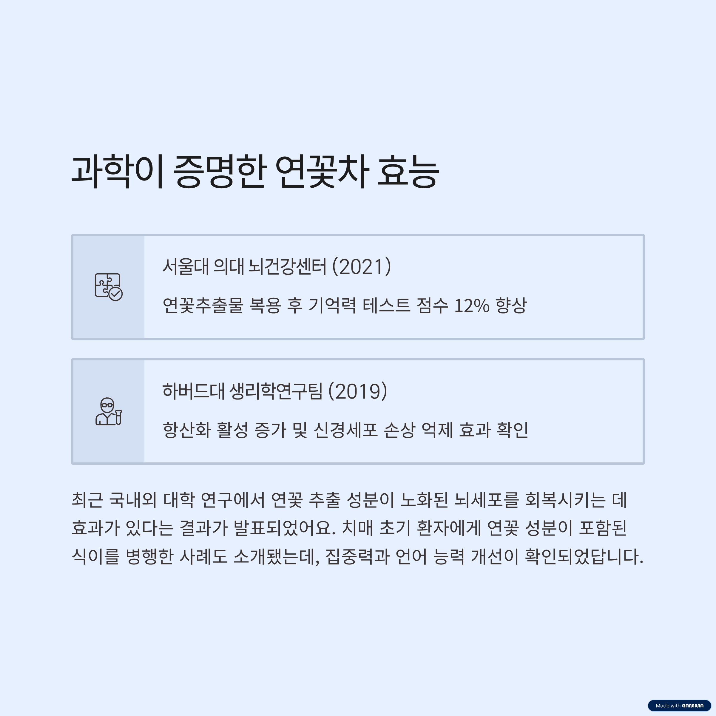 | 서울대 의대 뇌건강센터(2021) | 연꽃추출물 복용 후 기억력 테스트 점수 12% 향상 |